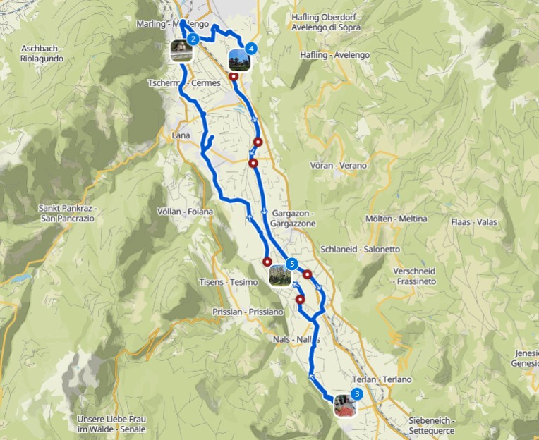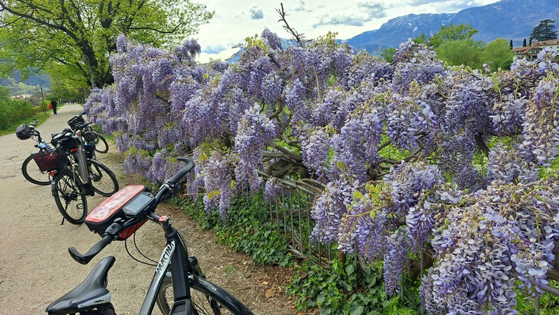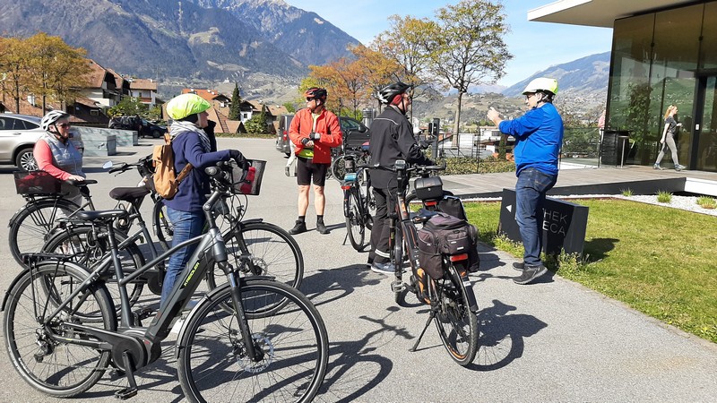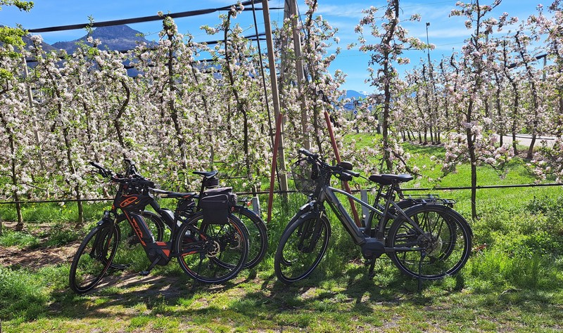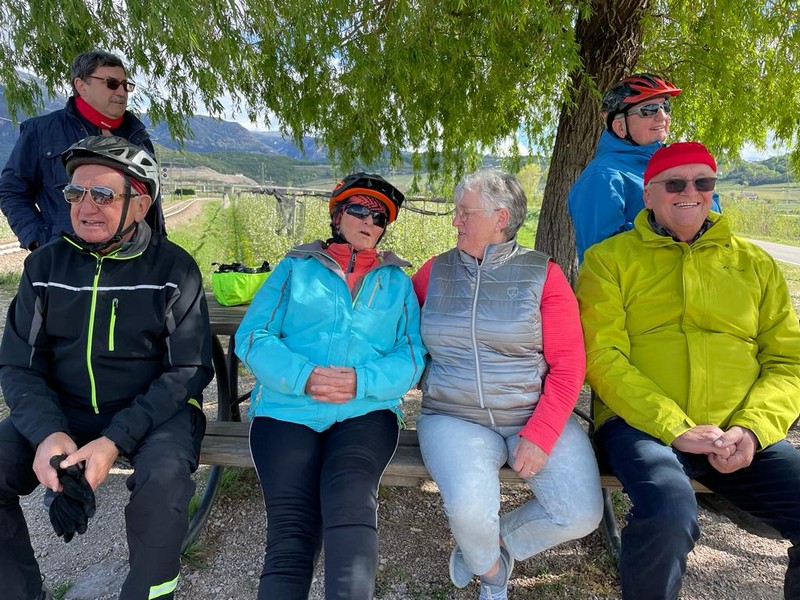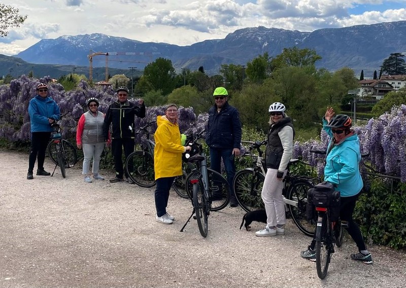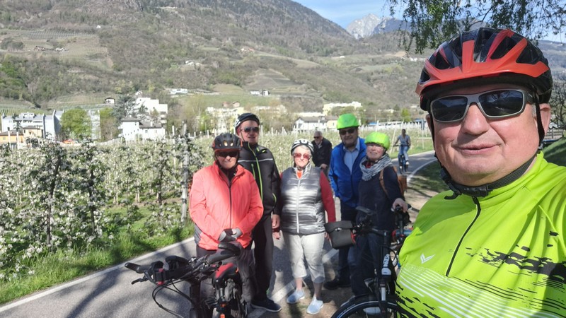 Nach der Mittagspause ging es gemütlich weiter nach Lana, wo eine Kaffee- oder Eispause angesagt war. Über Tscherms fuhren wir dann nach Marling und weiter nach Meran zum Etschtal-Radweg, auf dem wir zurück nach Andrian zu unserem Hotel gelangten. Es war eine sehr gemütliche Tour über 43 km durch das schöne blühende Südtirol.