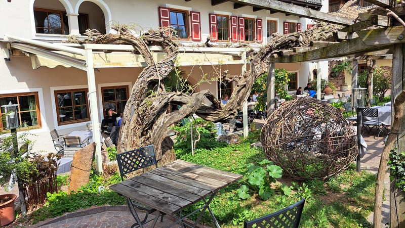 Unsere Zimmer waren schon fertig, so daß wir uns gleich für eine erste Radtour kurze umziehen konnten. Wir fuhren durch die schon blühenden Apfelplantagen, vorbei an Nals, zu Kathi’s Jausenstation um dort Mittag zu machen. Zum Glück hatte Steff dort schon angerufen und einen Tisch für uns reserviert, da es heute, am Ostermontag, doch ziemlich voll war. Beim Essen waren wir uns fast alle einig: Hirtenmakaroni.