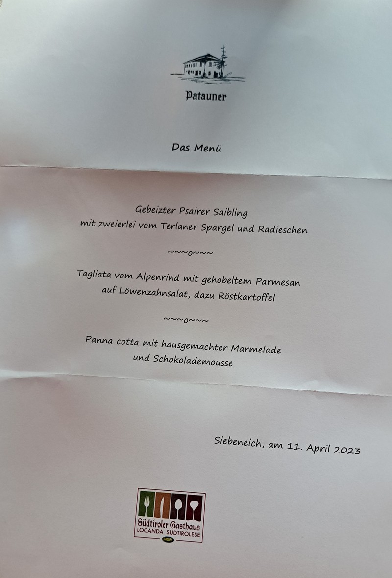 Am Abend fuhren wir mit den Autos nach Siebeneich ins Restaurant Patauner, wohin uns Elke unserer Geburtstagskind eingeladen hatte. Es gab ein sehr feines Menü und guten Rotwein.