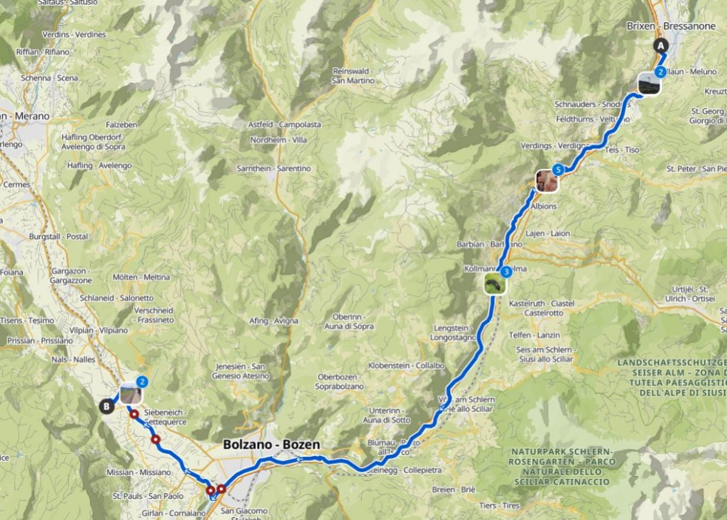 Nach der „Kaffeepause“ fuhren wir durch Bozen zur Eisack. Auf den uns schon bekannten super Radwegen ging es jetzt die Eisack entlang bis Frangart an die Etsch. Auf dem Etschtal-Radweg fuhren wir dann zurück nach Andrian, das wir nach 38 Kilometern erreichten.
