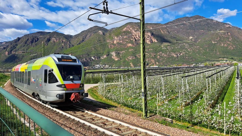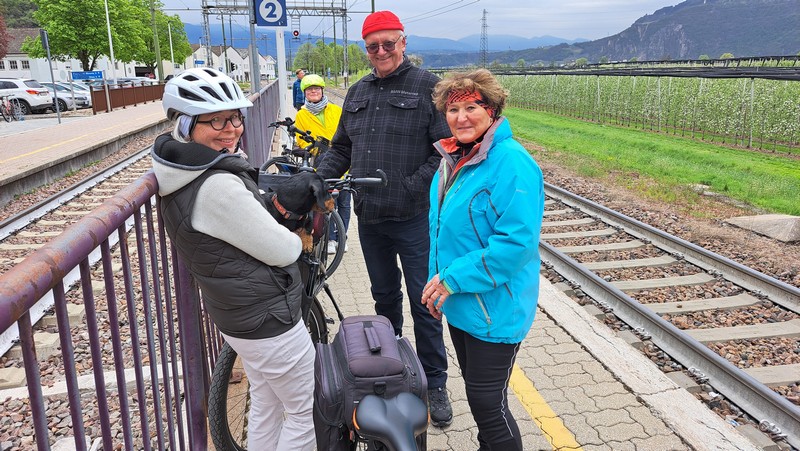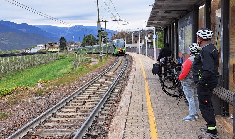 Per Rad ging es somit zuerst mal zum Bahnhof in Terlan. Der Zug kam pünktlich, aber es war gar nicht so leicht einen freien Platz im Zug zu finden. Er war schon ziemlich voll und unsere Räder sind ja doch „etwas sperrig“. Da der Bahnsteig niedriger als der Zug war mußten wir unsere Räder hochheben um in den Zug zu kommen. Wir acht verteilten uns in verschiedenen Zugabteilen.