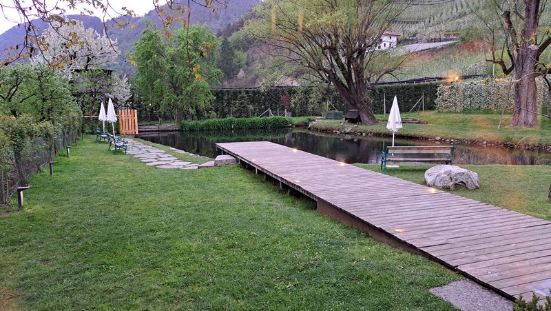 Der Garten unseres Hotels Andrianer Hof – nebenan befinden sich natürlich blühende Apfelplantagen
