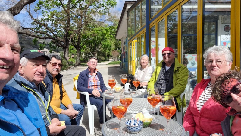 Auf der Talfer- bzw. Wassermauer-Promenade an der Bar St.Antonio. Hier gab es dann für uns doch keinen Kaffee, sondern für alle einen Aperol.