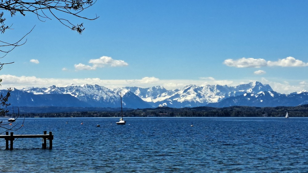 Start in Percha am Starnberger See – im Hintergrund sind die noch schneebedeckten Alpen zu sehen