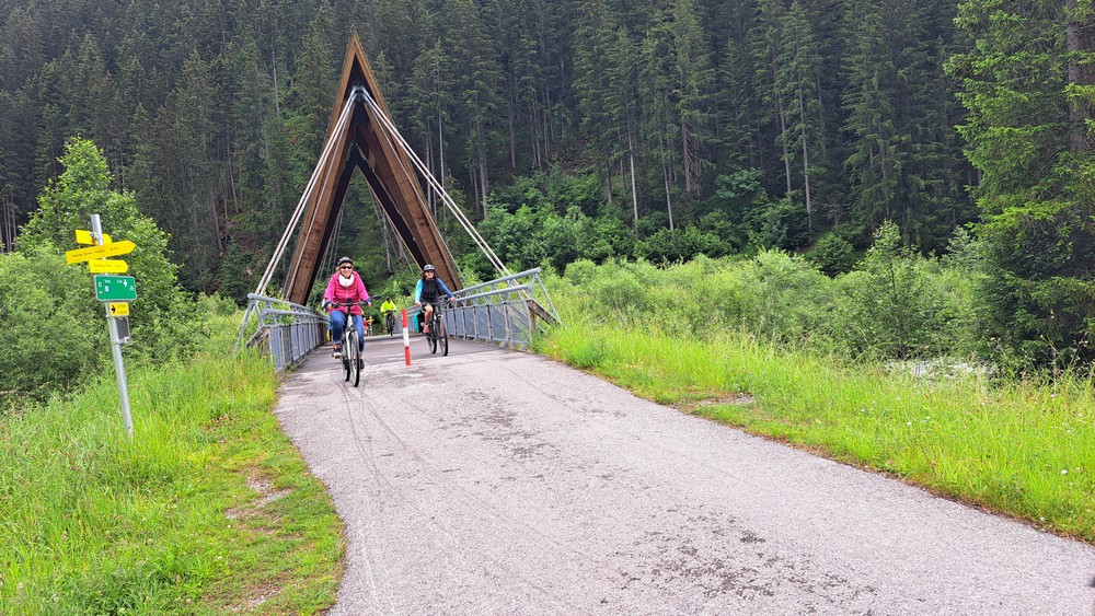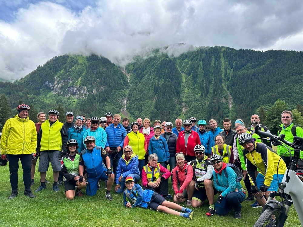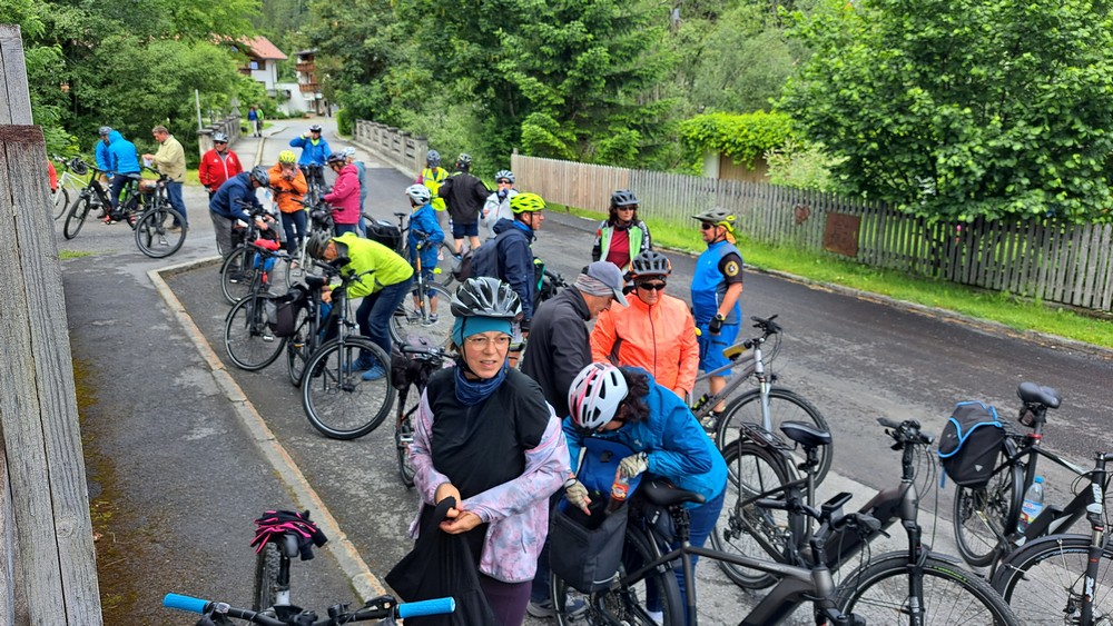 Die Vorstandschaft von Krieger- und Dorfverein Osterwaal e.V. hatte für Sonntag 23.Juni eine Radtour am Lechradweg organisiert. 41 Radlerinnen und Radler aus Osterwaal und der näheren Umgebung starteten um 6 Uhr morgens mit dem Bus und den eigenen Rädern im Radanhänger nach Österreich. Auf der Fahrt hatte es immer wieder geregnet, als wir aber das Ziel, Steeg im Lechtal, erreichte hörte der Regen zum Glück auf. Es war zwar ziemlich kühl, aber die E-Bike- und „Bio-Radler“ konnten unter Führung von zwei Radguides trocken losradeln. Leider verzogen sich die Wolken nicht richtig, so daß das Bergpanorama nicht zur Geltung kam. Aber die Radlertruppe war gut gelaunt und trotzte dem kühlen Wetter. Nach 25 km gab es im Gasthof Lechzeit, wo für alle Plätze reserviert waren, die verdiente Mittagspause mit Tiroler Schmankerl.