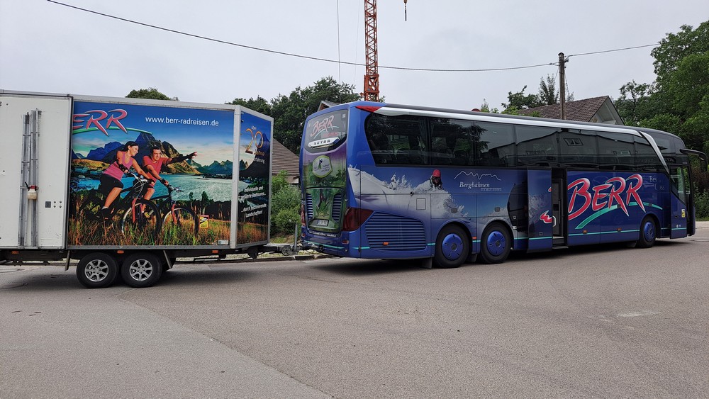 Die Räder werden in den großen Radanhänger vom schönen Bus verladen