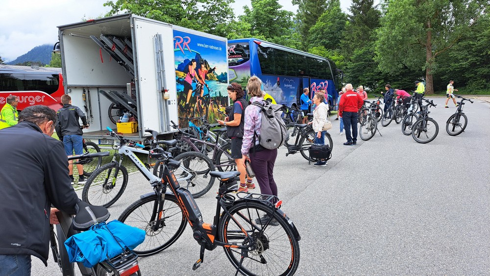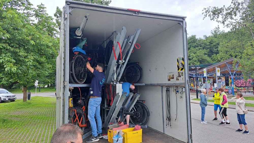 Wir sind in Reutte angekommen. Die Räder werden wieder in den Radanhänger verladen.