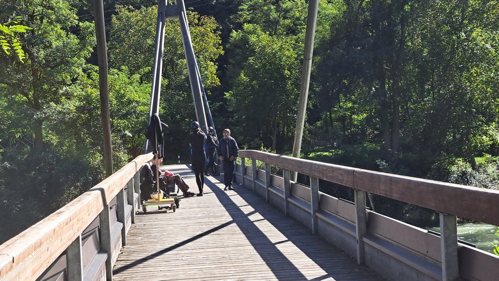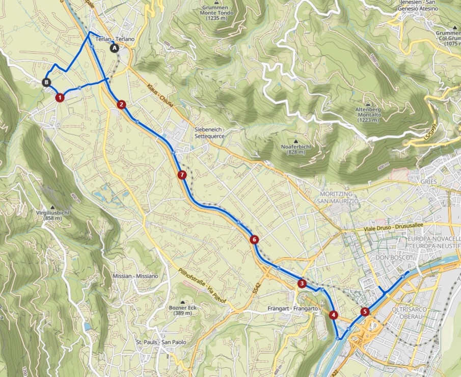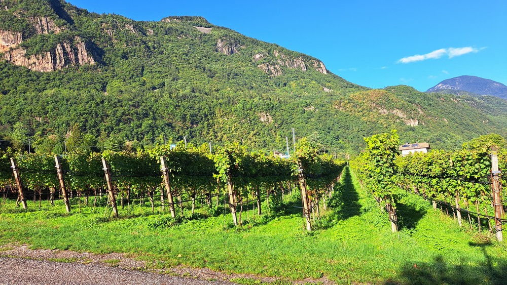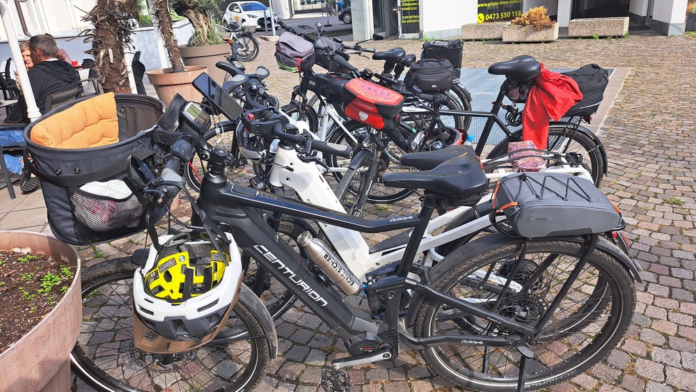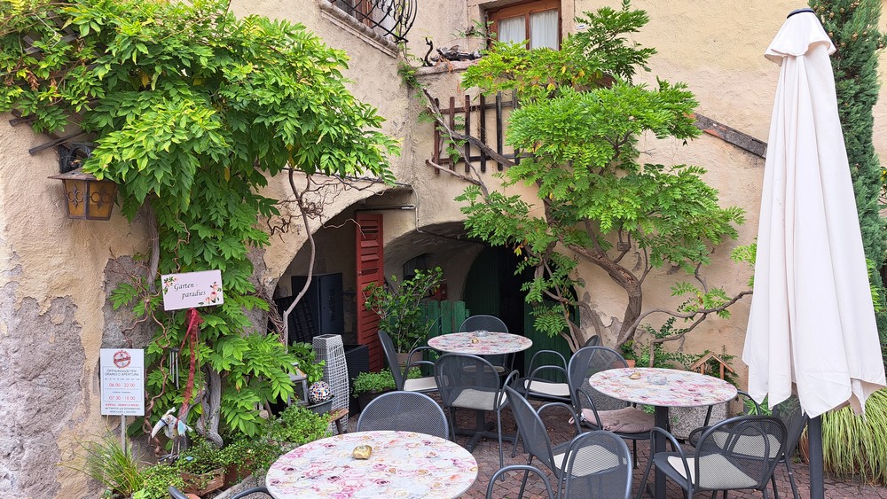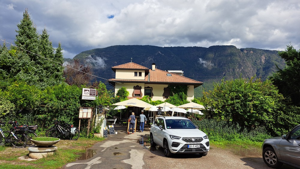 Hier legten wir beim Bistro-Cafe Rosenkeller eine Pause mit „Bauerntoast“ ein. Zurück ging es dann zuerst entlang der Eisack und dann wieder an der Etsch nach Terlan und Andrian.