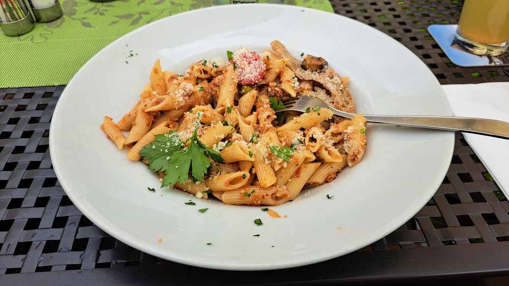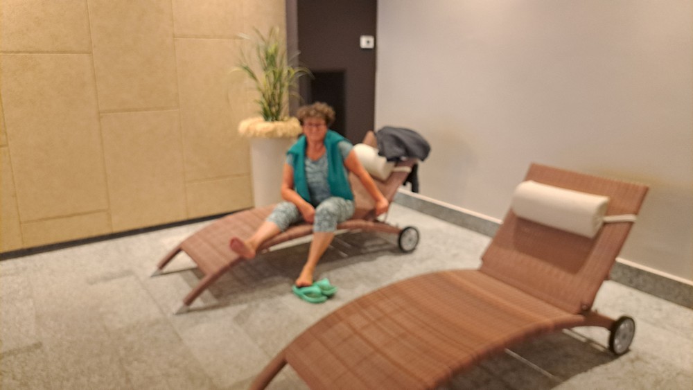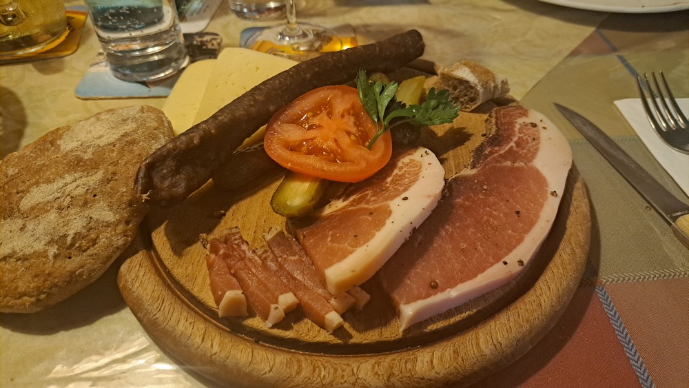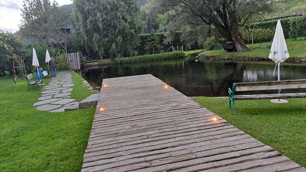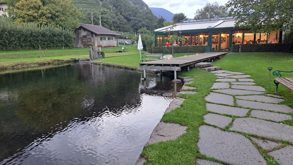 Zusammen mit Gitte testete ich dann in unserem Hotel das neu renovierte Hallenbad, bevor es um 18 Uhr zu sechst per Auto durch die Obstplantagen zum Restaurant und Buschenschank Pircher ging. Keiner von uns war bisher hier gewesen. Aber künftig werden wir hier wohl öfters einkehren. Es war sehr gemütlich, nette Wirtsleute und Bedienungen, gutes Essen das auch sehr schnell serviert wurde. Ich genoß eine super Brotzeitplatte mit Speck, Kaminwurzen, Käse und Vinschgerl.