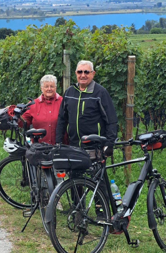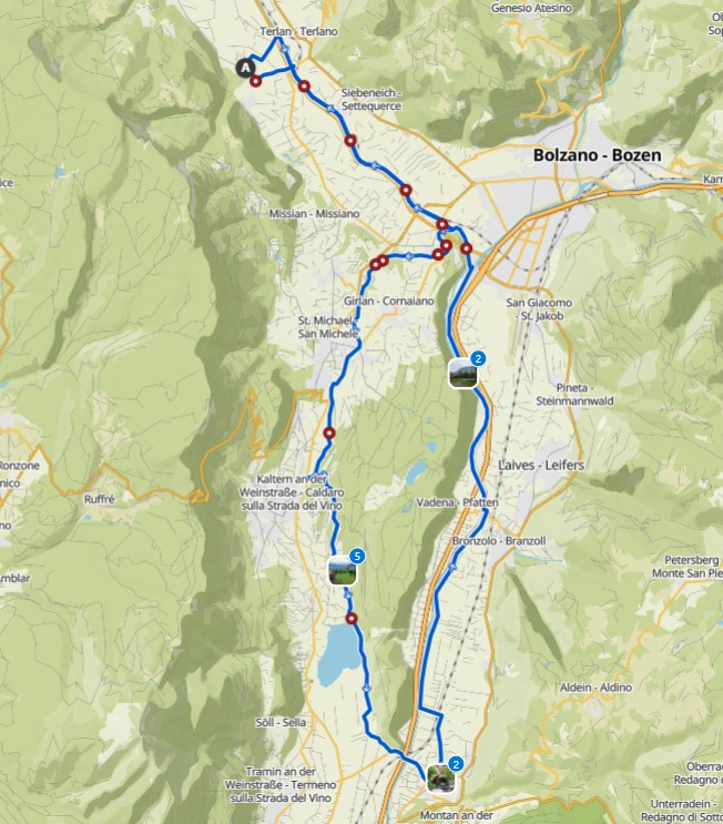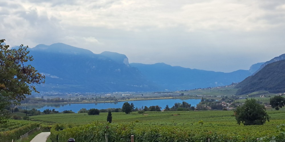 5.Tag: Gitte blieb auch heute im Hotel und Hermann und Irmi wollten ins Passeiertal. So starteten nur Stefan, Resi und ich runter nach Terlan, dann am Etschtalradweg nach Sigmundskron. Dort fuhren wir wieder zum Teil auf der bekannten alten Bahntrasse nach oben. Es ging vorbei an Girlan und St.Michael bis nach Kaltern. Heute machten wir hier nicht Halt, sondern fuhren gleich durch die Weinberge runter zum Kalterer See und dann weiter bis nach Auer.