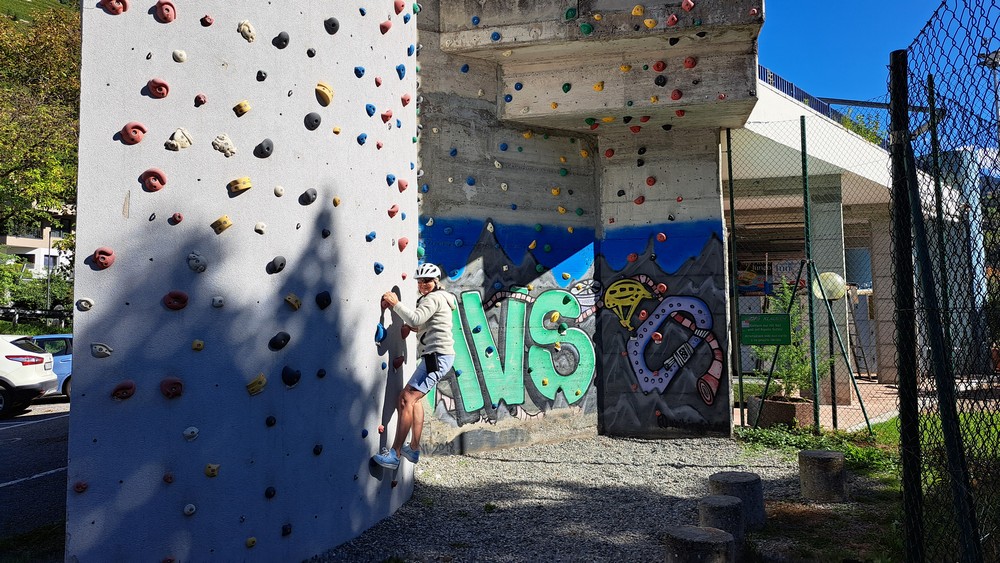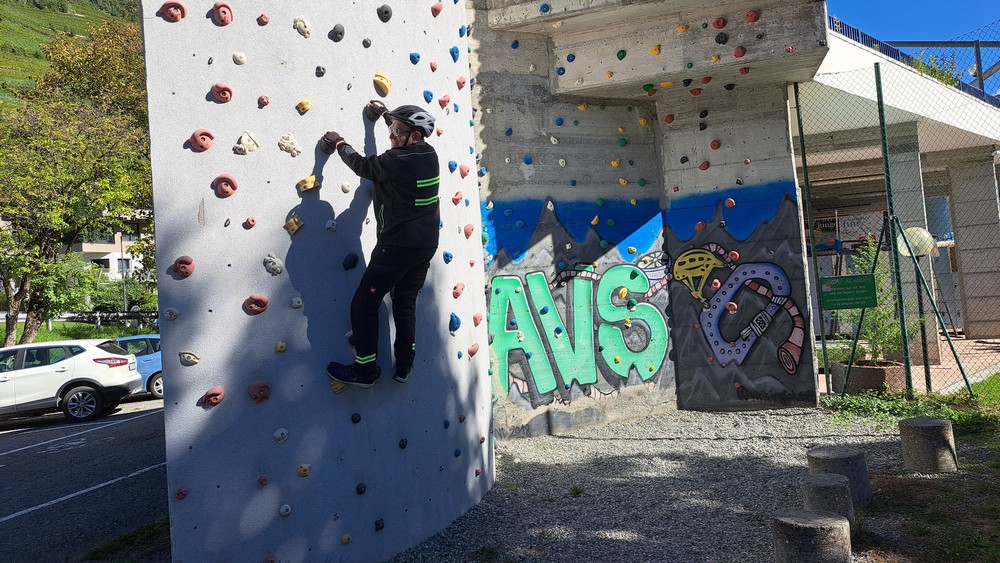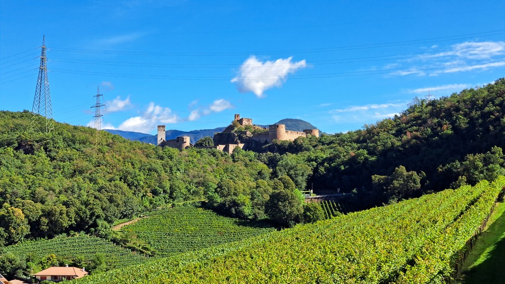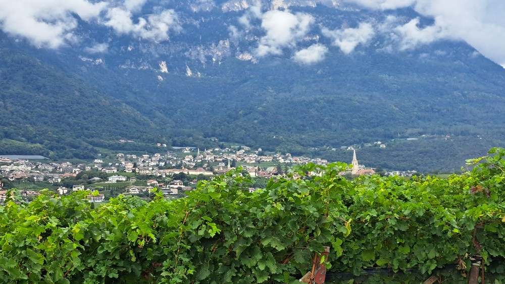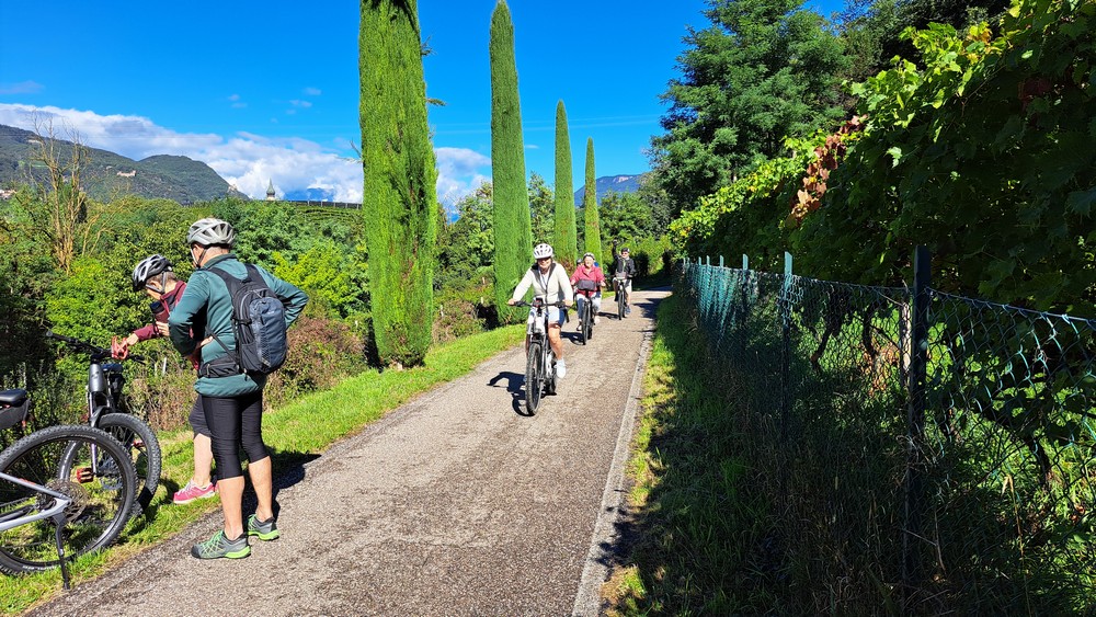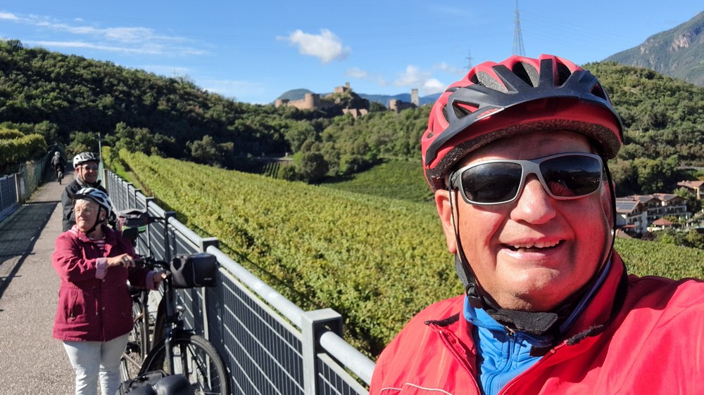 2.Tag: Gitte fühlte sich heute krank und blieb daher nach dem sehr guten Frühstück lieber im Bett. Zwei unserer Radlerfreunde wohnten in einer Ferienwohnung in der Nähe. Gemeinsam mit ihnen starteten wir somit um 11 Uhr nur zu fünft runter zum Etschtalradweg. Heute war es nicht mehr so warm. Also war kurze Hose und warmes Oberteil mit dünner Jacke angesagt. Wir folgten dem Radweg nach Sigmundskron. Dort fuhren wir zum Teil auf der uns schon bestens bekannten alten Bahntrasse, die jetzt als Radweg ausgebaut ist und auch durch einige Tunnels führt nach oben. Es ging vorbei an Girlan und St.Michael bis nach Kaltern.