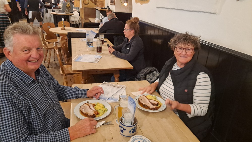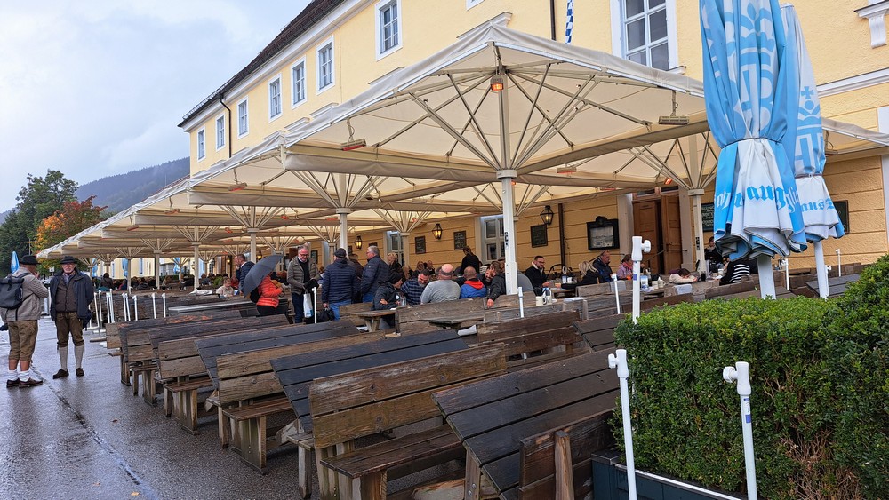 Wir alle starteten nach dem Frühstück, nachdem wir uns von der Hotelchefin und den Mitarbeiterinnen verabschiedet hatten, Richtung Hallertau. Gitte und ich fuhren teils über die Autobahn und teils über die Landstraße noch nach Barbian zur Metzgerei Trockner, bei der wir uns mit Speck und Kaminwurzen eindeckten. Dann ging es bei relativ wenig Verkehr und ohne Stau weiter über den Brenner nach Österreich. An der Ausfahrt Zillertal verliesen wir die Autobahn und fuhren jetzt über den Achenpass zum Tegernsee, da wir im dortigen Bräustüberl Pause machen wollten. Wir bestellten Bierbraten und ein Tegernseher Bier. Das Essen wurde schnell serviert und schmeckte super!