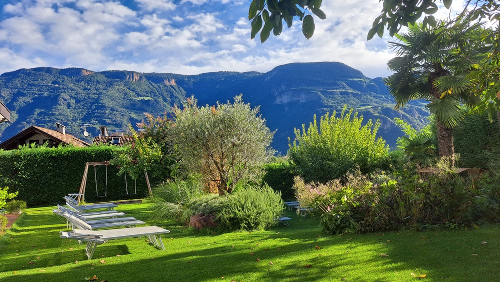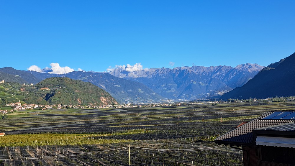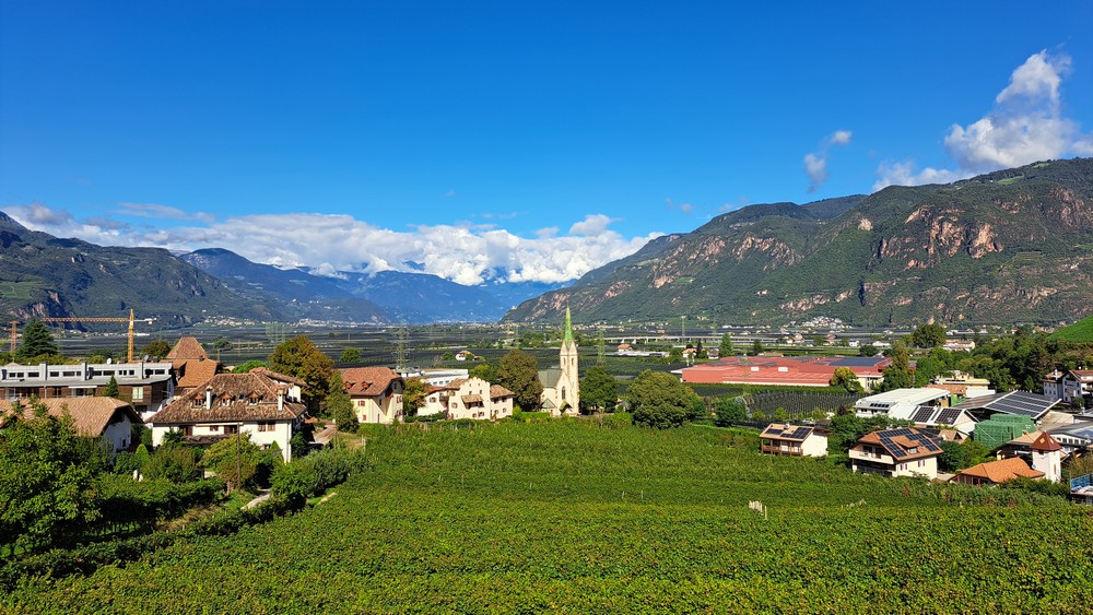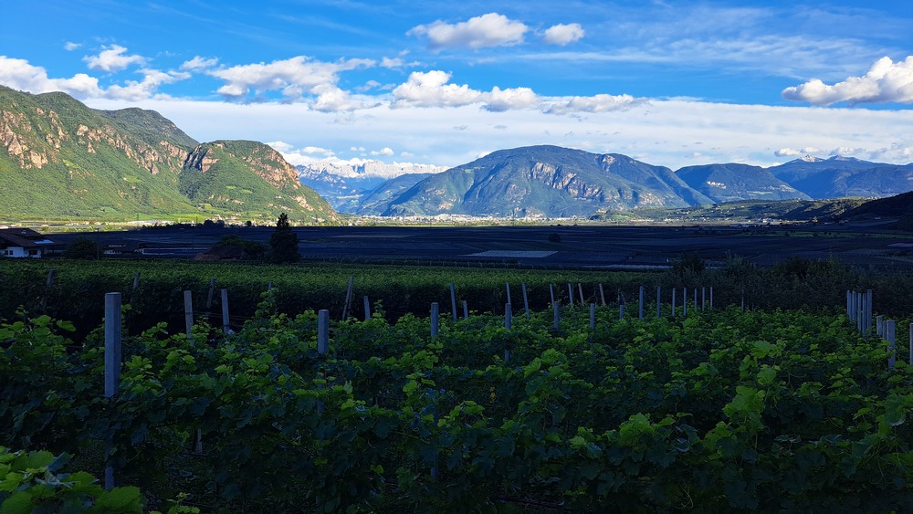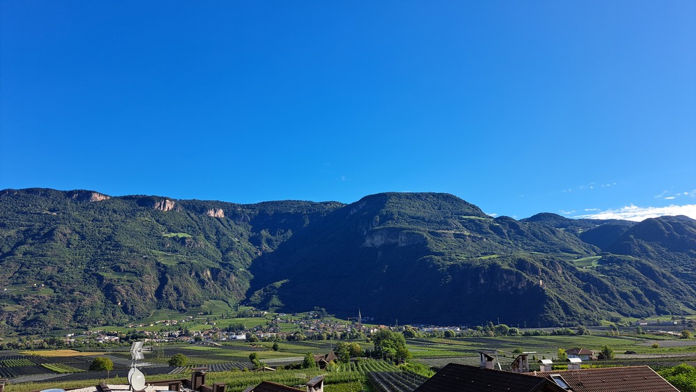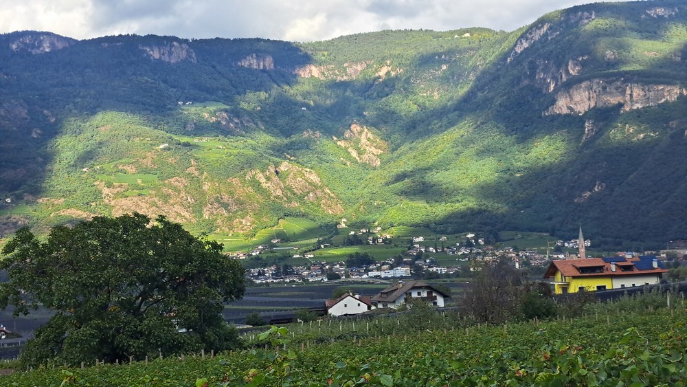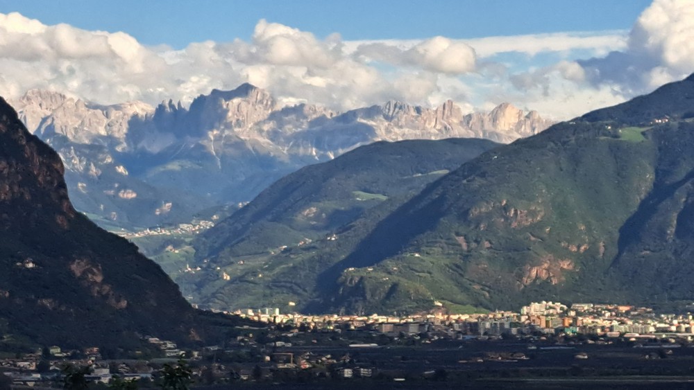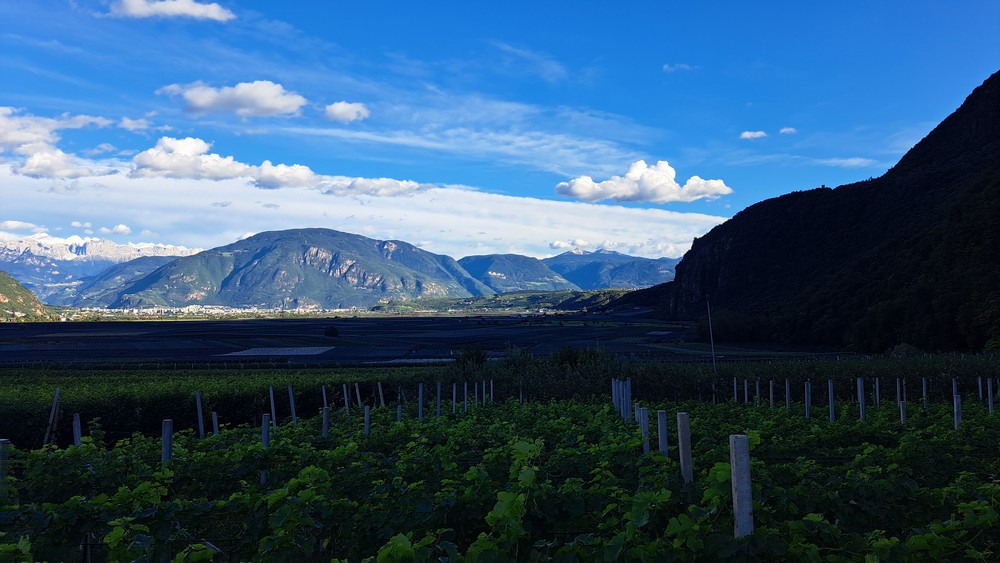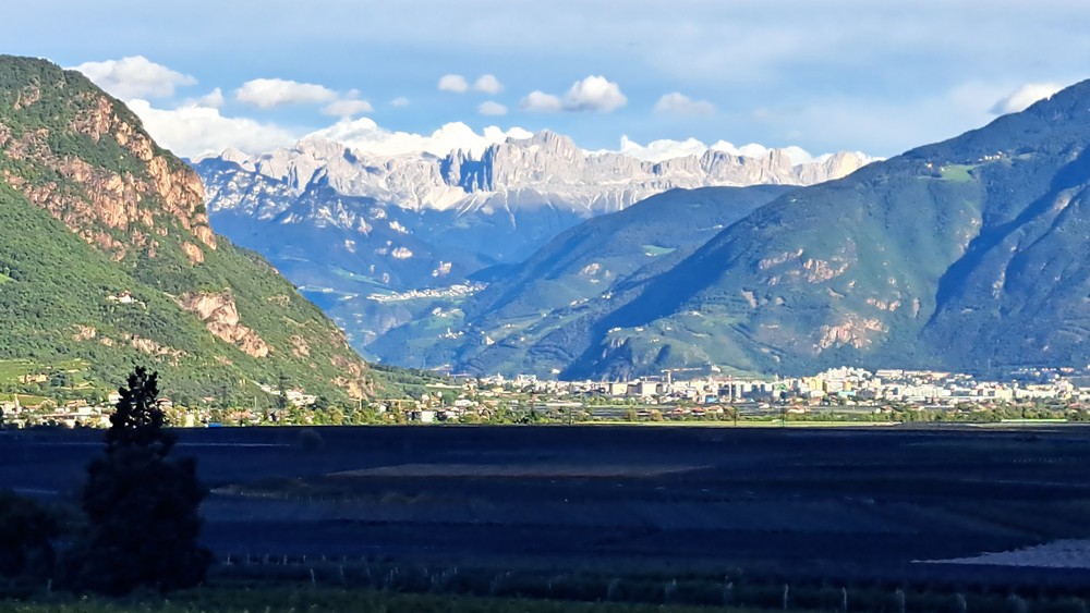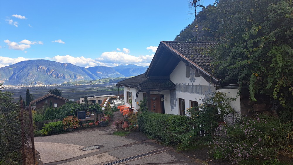 An der Pizzeria Mühlbach, hoch über Andrian – hier kann man schön nach Bozen und bis zum Rosengarten schauen.