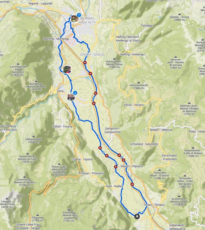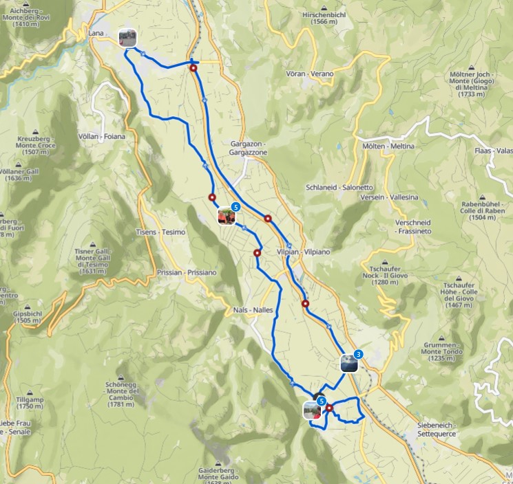 Jetzt war es langsam Zeit für den Rückweg. Wir fuhren nach Marling hoch, dann nach Lana wo wir eine kleine Pause einlegten und schließlich durch die Apfelplantagen zurück nach Andrian.