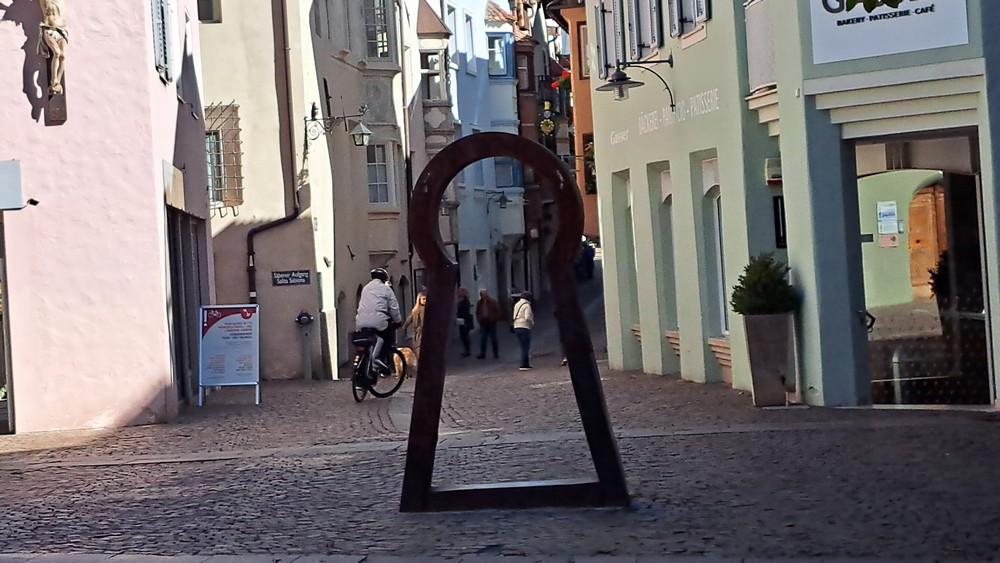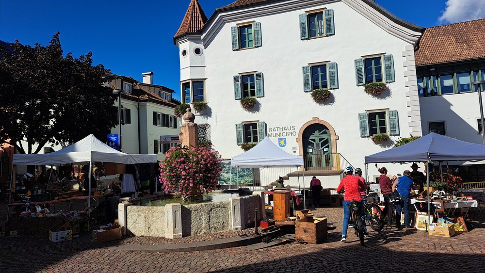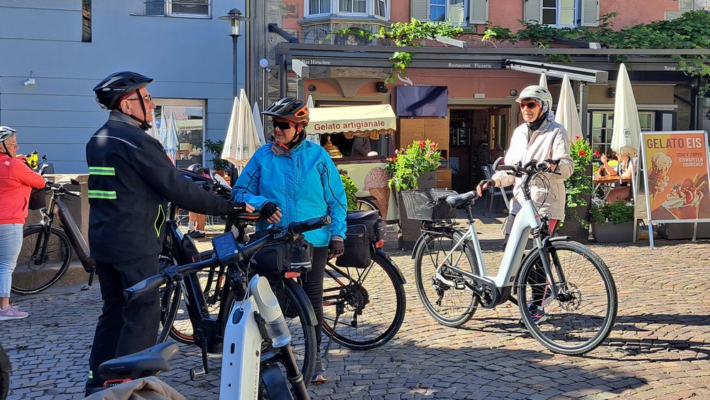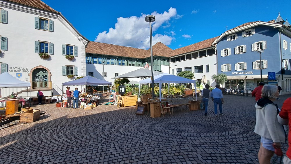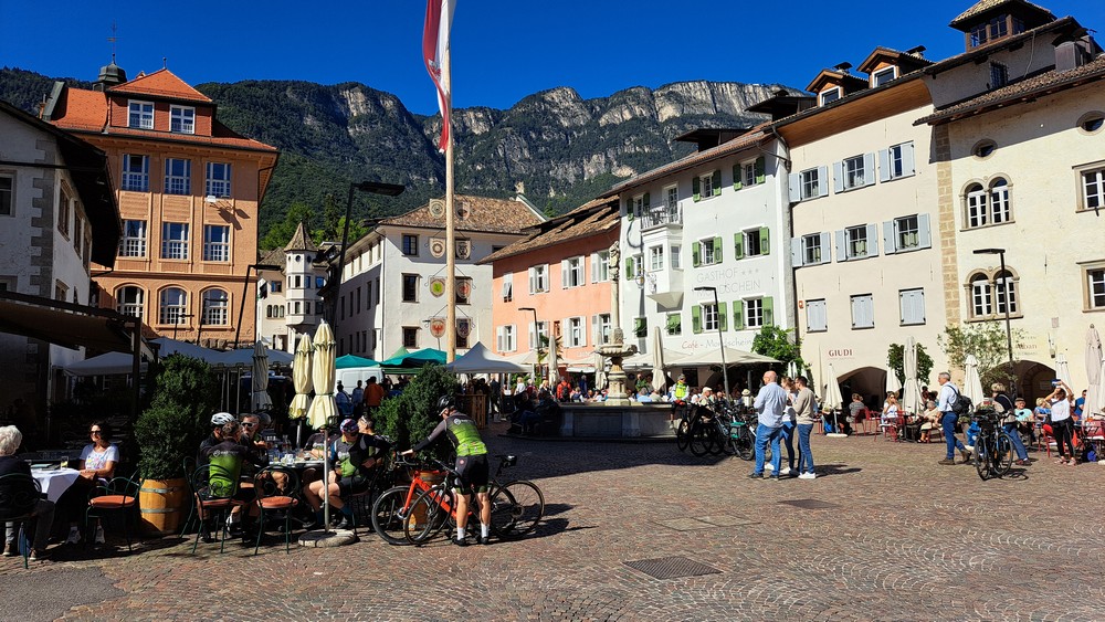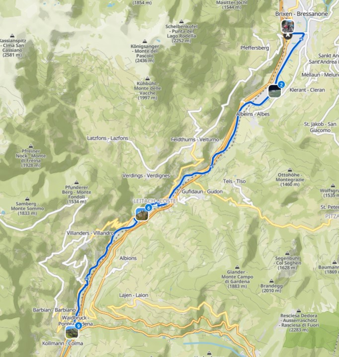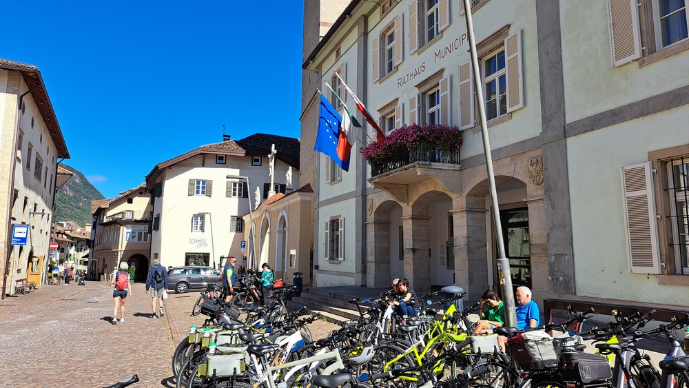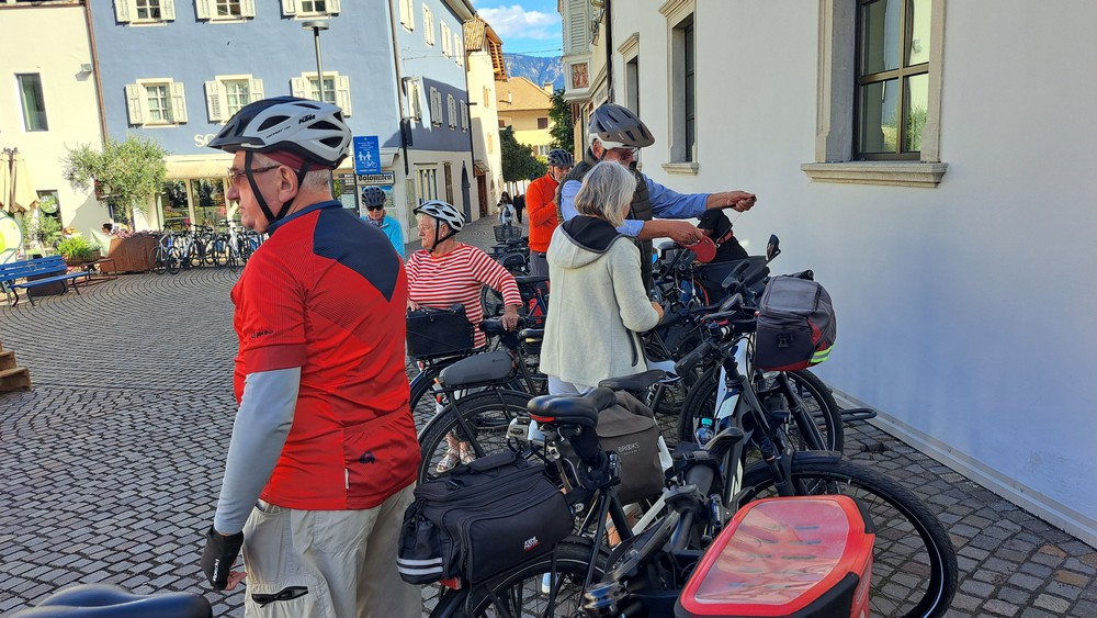 3.Tag: Heute war eine Zugfahrt nach Brixen eingeplant. Nach dem Frühstück fuhren wir zu acht per Rad zum Bahnhof Terlan. Um 9:39 Uhr starteten wir mit dem Zug nach Brixen, wo wir um ca. 10:30 Uhr ankamen. Um losfahren zu können, mußten die Fahrräder vom Bahnsteig hinunter und drüben wieder hochtransportiert werden. Aufzüge waren zwar vorhanden, aber unsere E-Bikes paßten nicht so richtig rein. Jetzt war Muskelkraft angesagt.