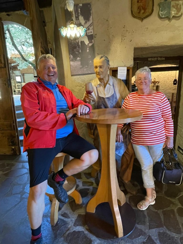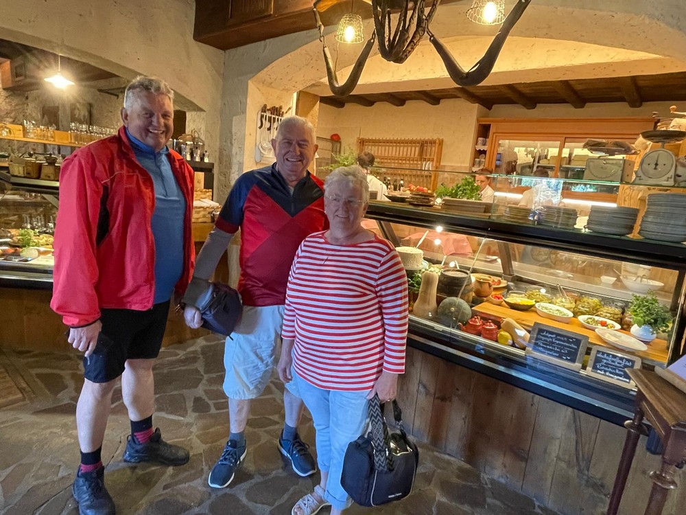 Hermann und Irmi, zwei weitere unserer Radlerfreunde waren inzwischen in unserem Hotel angekommen. Edi und Elke wollten heute nach Terlan zum essen fahren. Wir anderen sechs fuhren aber zur Pizzeria Mühlbach hoch. Später gabs dann noch einen Wein in unserem Hotel.
