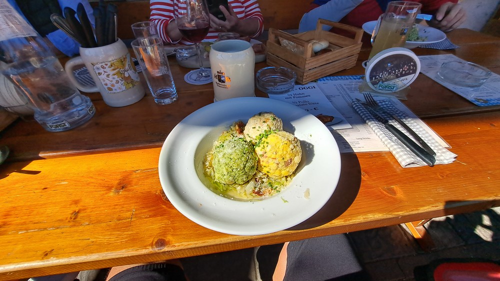 Schnell waren wir im Biergarten Kaltern, der etwas außerhalb liegt. Hier gab es die gewünschten warmen Speisen und für mich natürlich wieder „Tris“ (3 Knödel -Speck-Spinat-Käse- mit Krautsalat) – sehr lecker!