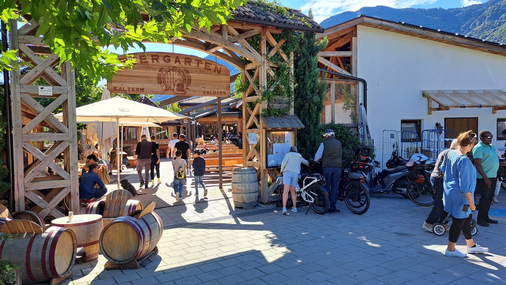 In Kaltern wollten wir Mittag machen. Am Marktplatz war alles voll, so fuhren wir ein Stück durch die Gassen und kamen schließlich zum Buschenschank Speckkeller. Wir setzten uns auf die Terrasse und bestellten was zu trinken. Erst dann bemerkten wir, daß es hier nur kalte Speisen gab und man sich die auch selbst holen mußte. Eigentlich hätten wir heute was warmes essen wollen. Wir beschlossen daher nur die bestellten Getränke zu trinken und dann weiter zum Kalterer Biergarten zu fahren.