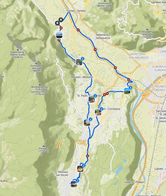 Gitte und unsere Freunde gingen in ihre Hotelzimmer, ich wollte aber noch etwas mit dem Rad fahren. So fuhr ich zuerst zur Pizzeria Mühlbach hoch, dann durch die Obstgärten rund um Andrian und schließlich zu unserem Hotel zurück.