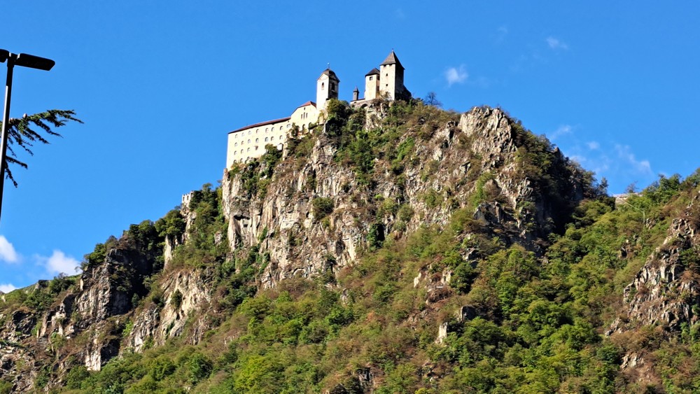 Halt an einem Aussichtspunkt. Hier kann man über das Tal und auch zur Burg Sigmundskron schauen.