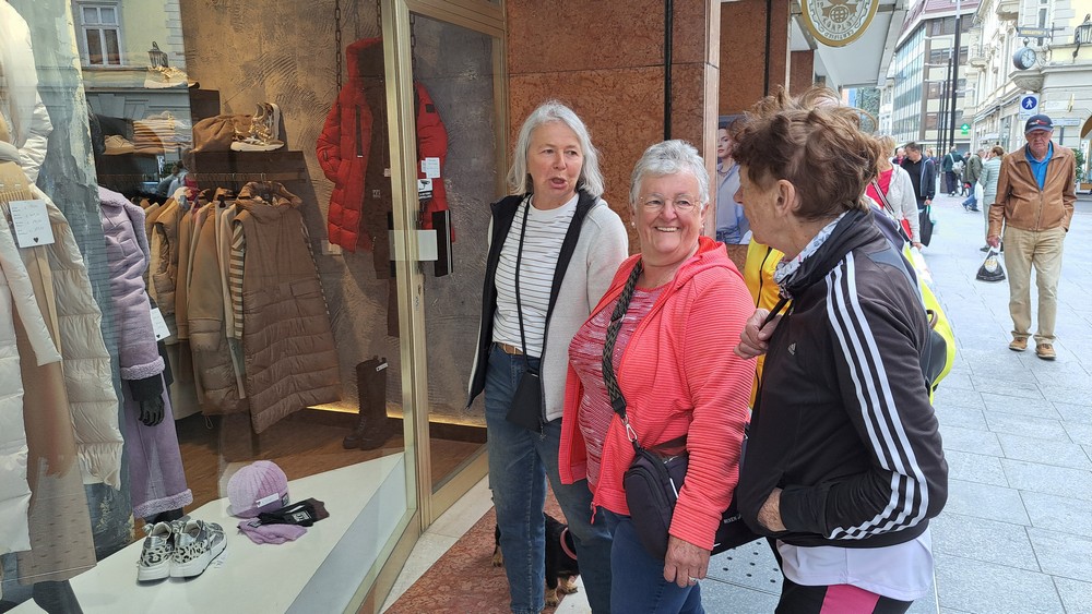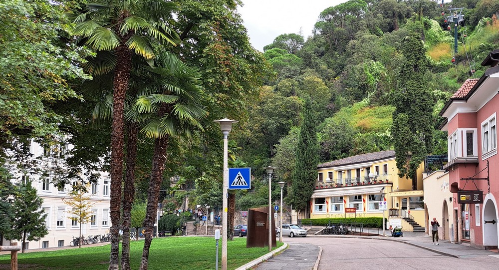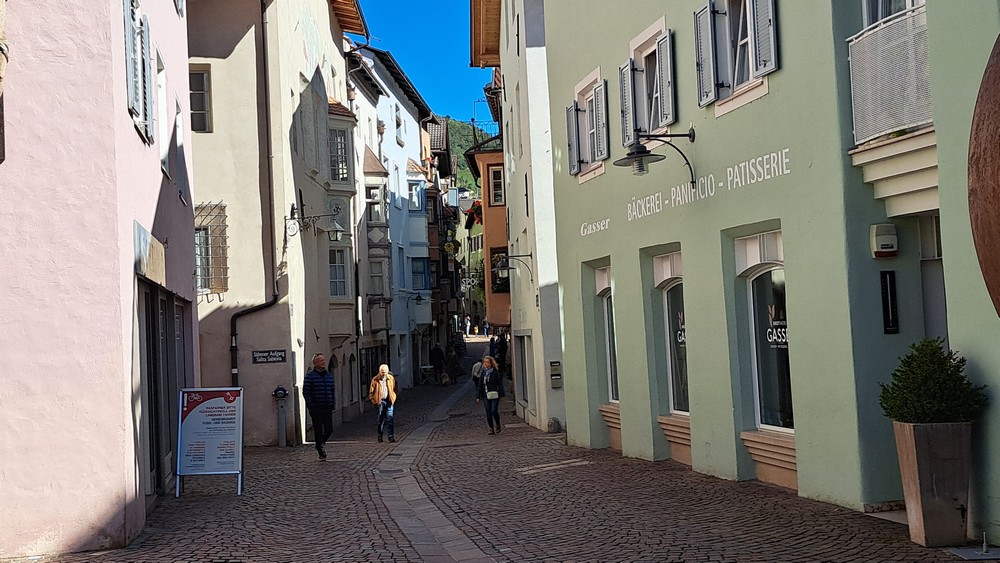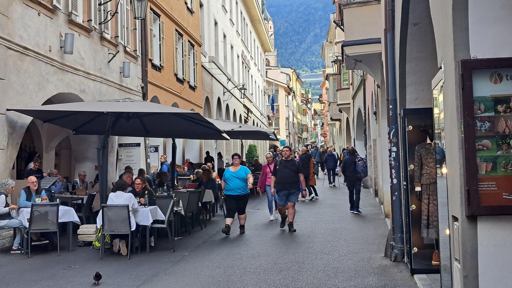 4.Tag: Heute wollten wir nicht allzuweit fahren. Die Wahl fiel auf Meran. Die Damen wollten in den Meraner Lauben bummeln. Wir fuhren zu siebt nach Terlan runter und dann auf dem Etschradweg nach Meran. Der Radweg ins Stadtzentrum verlief ganz schön hin und her, aber er war gut ausgeschildert und wir hatten ja auch ein Fahrradnavi. So kamen wir gut ans Ziel, stellten unsere Räder ab und los ging es durch die Meraner Lauben.
