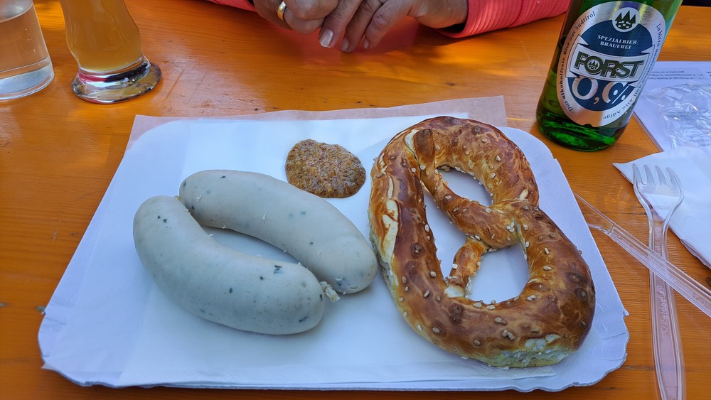 Als wir dann losfuhren war es noch ziemlich kalt, aber wir hatten ja passende Kleidung angezogen. Immer in der Nähe der Eisack ging es auf gut ausgebauten Radwegen nach Klausen. Für die Mittagspause war es noch zu früh, so daß wir nur durch die engen Gassen fuhren und kurz anhielten. Schon ging es weiter. Bei Waidbruck hörten wir eine Musikkapelle spielen und wir sahen auf der anderen Flußseite Menschen an Bierbänken sitzen. Da mußten wir hin. Es gab doch tatsächlich Weißwürste mit Brezen, die noch dazu überraschend gut schmeckten.