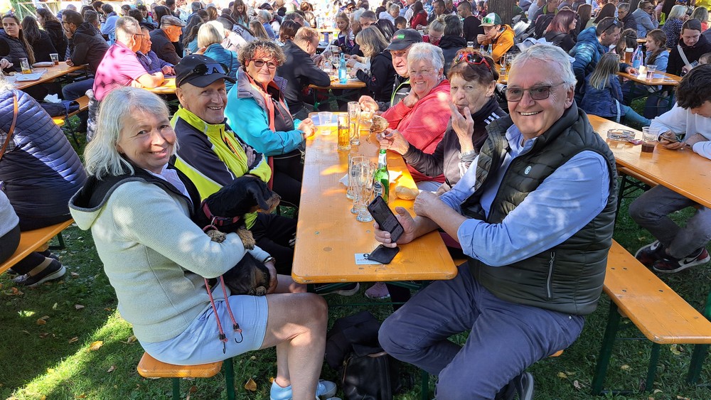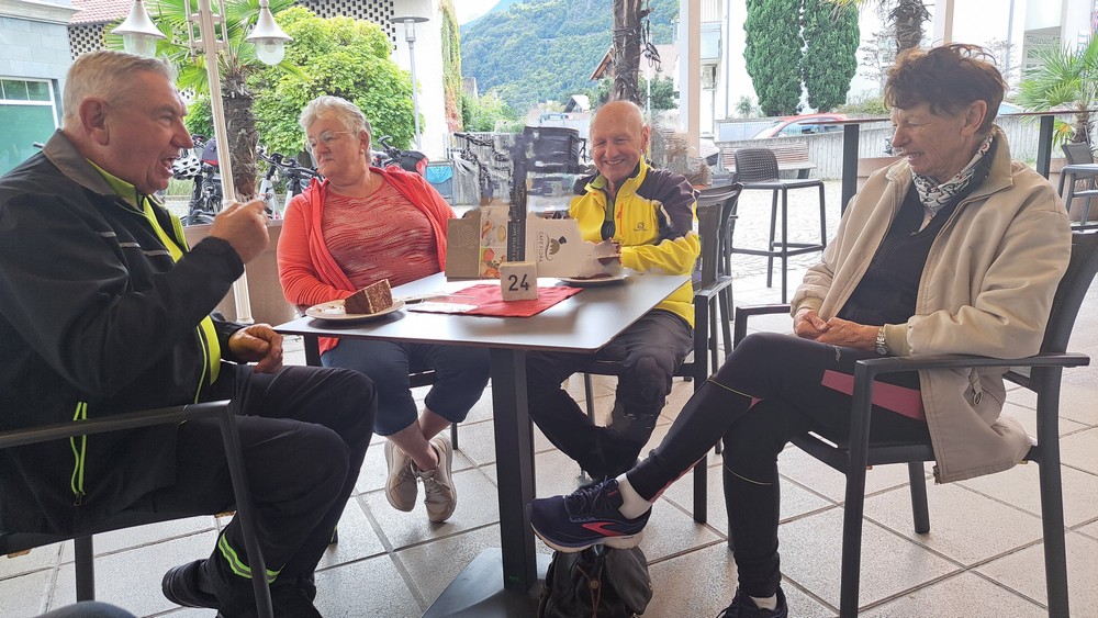 Wir starteten am Freitag um 6 Uhr in der Früh mit unseren E-Bikes am Heckträger des Autos. Auf der Autobahn war an diesem Freitagmorgen normaler Verkehr, so kamen wir schnell zur Ausfahrt Holzkirchen und schon nur wenige hundert Metern weiter zur Bäckerei Ratschillers wo wir frühstücken wollten. Dort trafen wir doch tatsächlich auch dieses Mal auf zwei befreundete Paare aus der Hallertau. „So ein Zufall“.