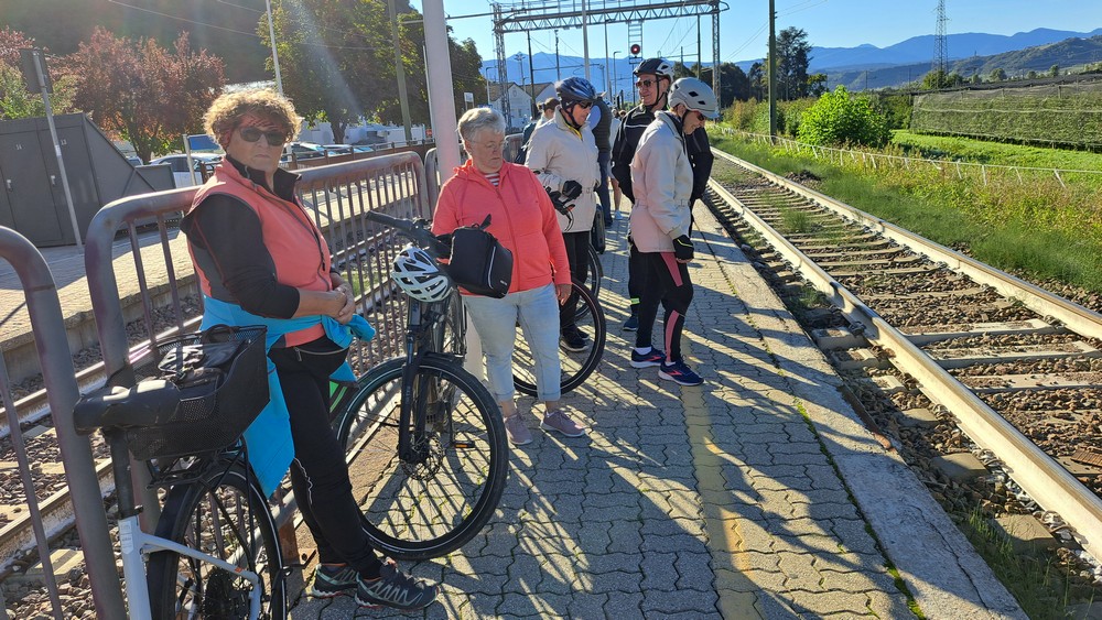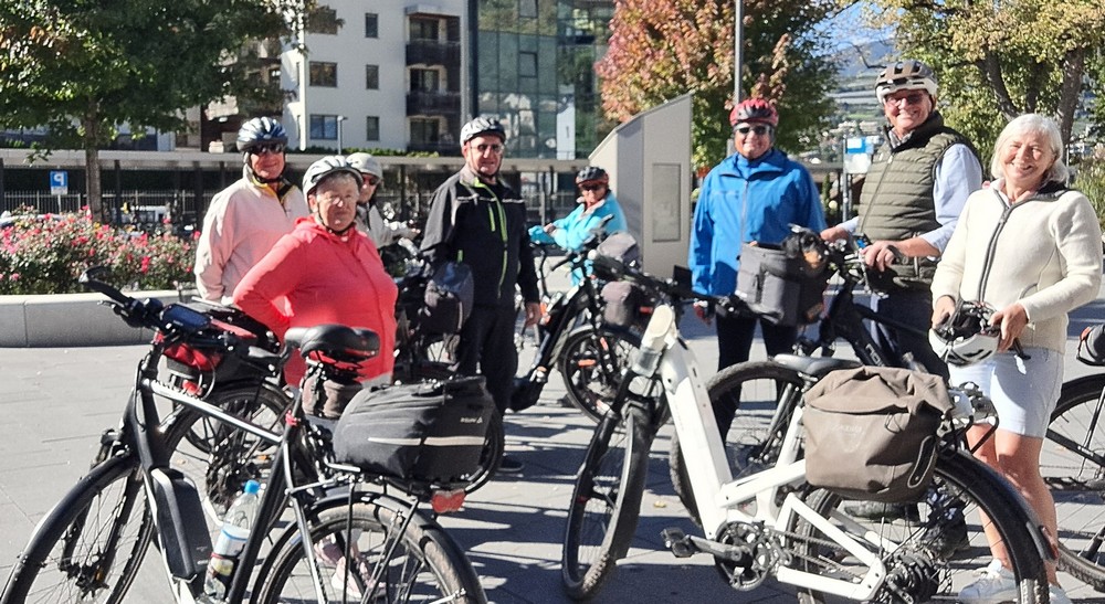 Unsere Radlergruppe am Bahnhof Brixen. Heute sind wir warm angezogen. Jetzt kann es losgehen