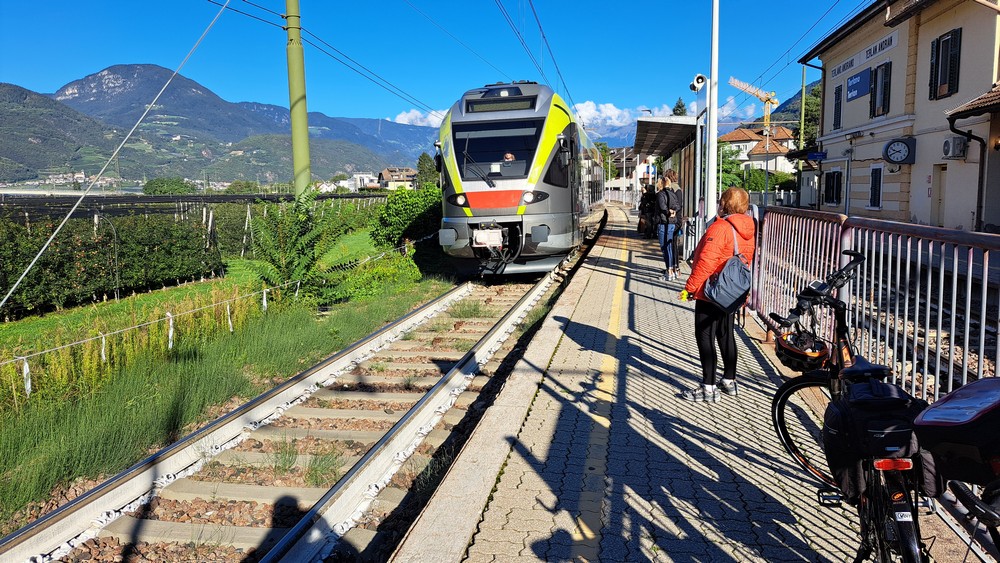 Leider wurde es Gitte plötzlich schwindelig. Wir entschieden uns daher nicht mit den anderen weiter zu fahren, sondern lieber den Zug zu nehmen. In Waidbruck gab es zum Glück einen Bahnhof. Wir mußten zwar etwas warten, kamen dafür aber wohlbehalten zurück nach Terlan und dann den letzten Kilometer per Rad nach Andrian. Gitte legte sich hin, ich fuhr aber den anderen Radfahrern Richtung Bozen entgegen. Als ich schon mitten in Bozen war, hatte ich sie immer noch nicht getroffen. Ich telefonierte und erfuhr, daß sie schon im Hotel waren. Sie hatten eine andere Strecke, als gedacht, genommen. Also fuhr auch ich schnell zurück.