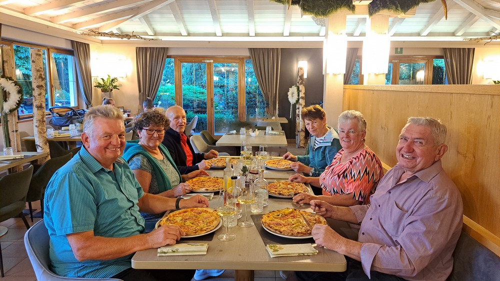 Elke und Edi verliesen uns jetzt und fuhren schon heute zurück in die Hallertau. Wir anderen fuhren mit den Autos Richtung Eppan in das Restaurant Pizzeria Wiesenheim. Dort sollte es zwar auch Pizzen, aber außerdem viele andere Spezialitäten geben. Die Wahl fiel dann aber bei allen doch auf eine Pizza. Später gab es dann im Hotel wieder einen Wein zum Abschluß eines schönen Tages.