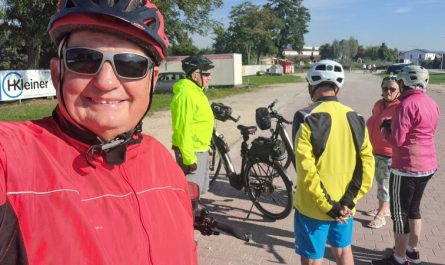 Wir starteten am Freitag um 6 Uhr in der Früh mit unseren E-Bikes am Heckträger des Autos. Auf der Autobahn war an diesem Freitagmorgen normaler Verkehr, so kamen wir schnell zur Ausfahrt Holzkirchen und schon nur wenige hundert Metern weiter zur Bäckerei Ratschillers wo wir frühstücken wollten. Dort trafen wir doch tatsächlich auch dieses Mal auf zwei befreundete Paare aus der Hallertau. „So ein Zufall“.