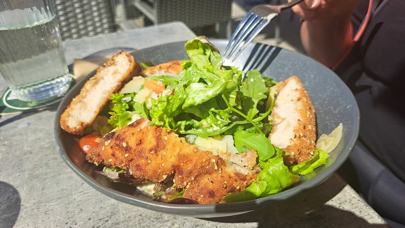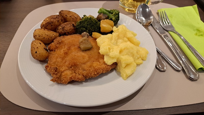 Als wir um 17:15 Uhr im Hotel ankamen war unser Zimmer natürlich schon längst bezugsfertig. Die E-Bikes parkten wir in der Tiefgarage und dann brachten wir unser Gepäck in unser Zimmer, das frisch renoviert war. Wir ruhten etwas und schauten die 1.Halbzeit des Fußballspiels Bayern-Dortmund über Sky Go am Handy an. Dann war es Zeit fürs Abendessen. Es gab wieder gutes Essen vom Bufet mit vielen leckeren Speisen.