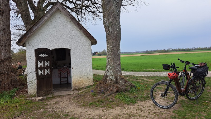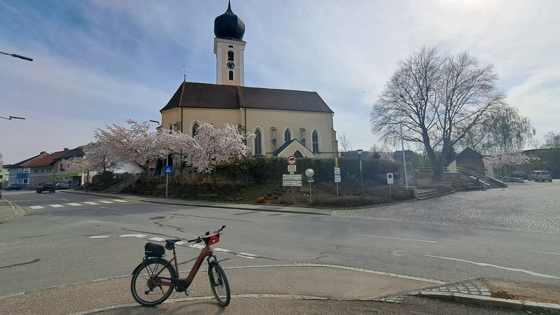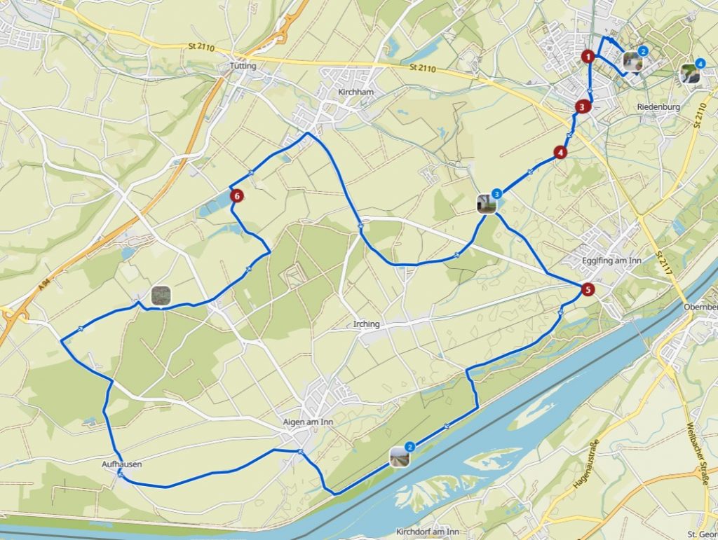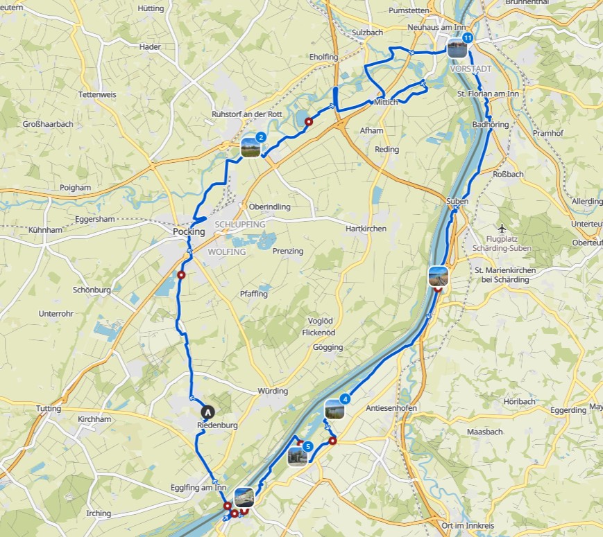 Zurück zum Hotel fuhren wir mit dem Bäderbus. Das Mittagessen liesen wir ausfallen und starteten am Nachmittag gegen 14:30 Uhr bei nicht mehr ganz so warmen Temperaturen und bewölktem Himmel wieder mit den E-Bikes los. Wir wollten heute nur gemütlich radfahren und hatten uns die als „Schwalbentour“ ausgeschilderte Strecke ausgewählt. Von Bad Füssing aus ging es zuerst nach Egglfing, dann in die Innauen und dort teilweise den Inndamm entlang nach Aigen. Jetzt führte der Radweg weg vom Inn nach Aufhausen, Voglarn und Hart. Über Hoheneich, Kirchham und Zanklöd ging es zurück nach Bad Füssing.
