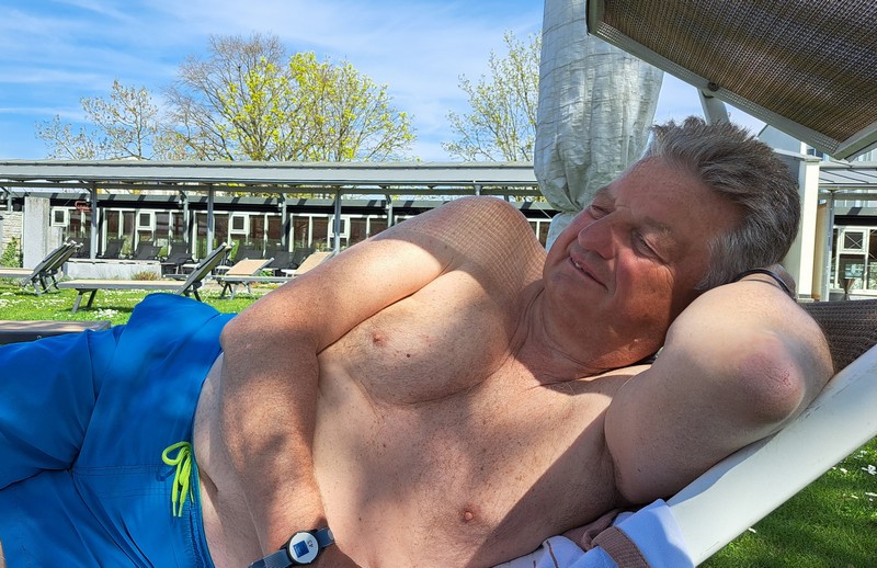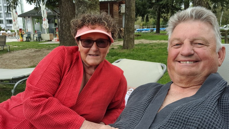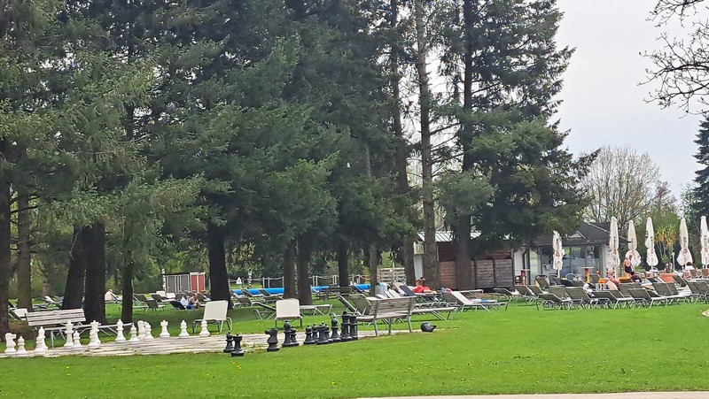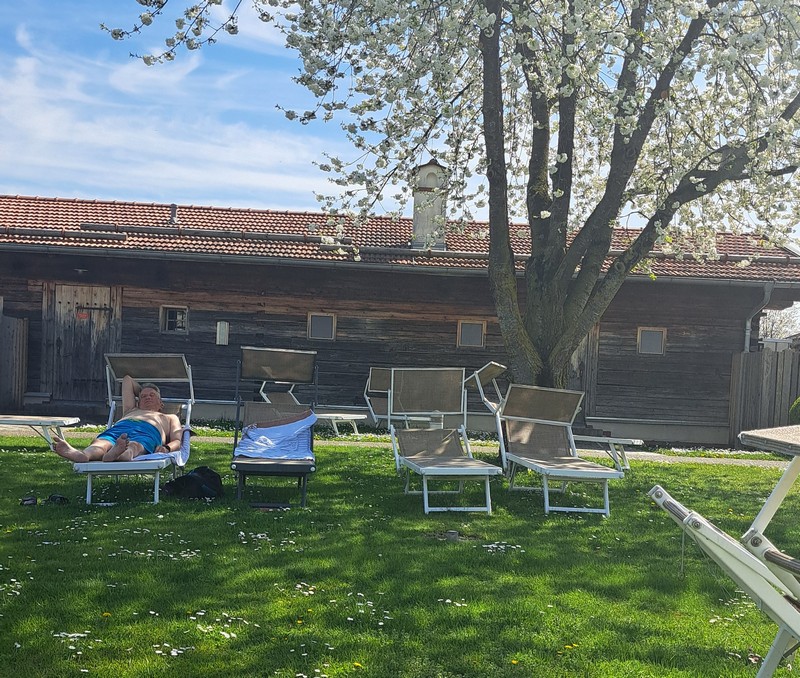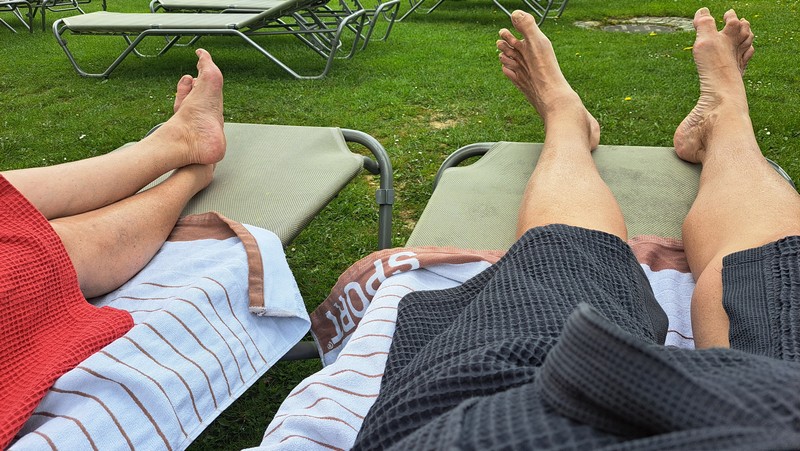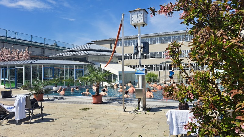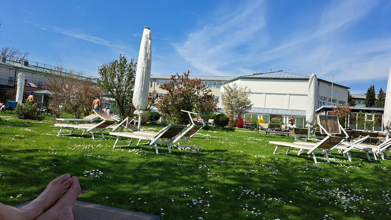 3.Tag: Nach dem Frühstück ging es heute mal per Rad erstmals in die Therme 1, da der Eintritt in diese Therme im Hotelpreis dabei war. Heute war es wieder sehr sonnig und warm, so daß wir nach dem Schwimmen und nachdem wir alle Außenbecken ausprobiert hatten auf der schönen Liegewiese die Sonne genießen konnten.