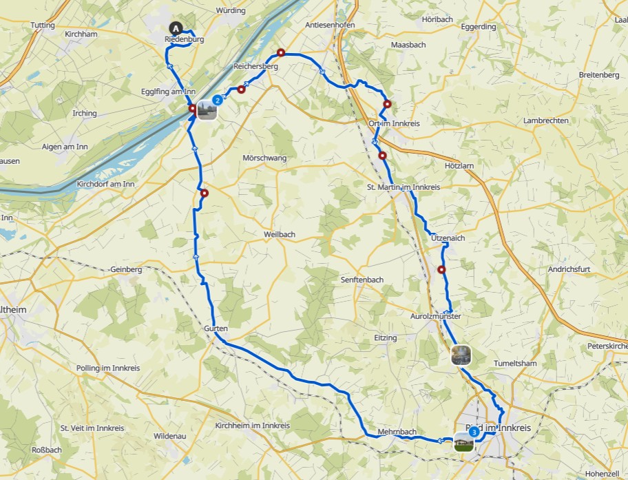 Entlang der Braunauer und dann der Riederstraße führte der Radweg nach Mehrnbach. Jetzt ging es über Blindenhofen und Langdorf wieder immer am Radweg entlang der Straße nach Gurten. In Freiling war dann der Radweg zu Ende und ich mußte auf der normalen Straße weiterfahren. Kurz vor Obernberg gabs dann wieder einen Radweg und so ging es über den Inn zurück nach Bad Füssing.