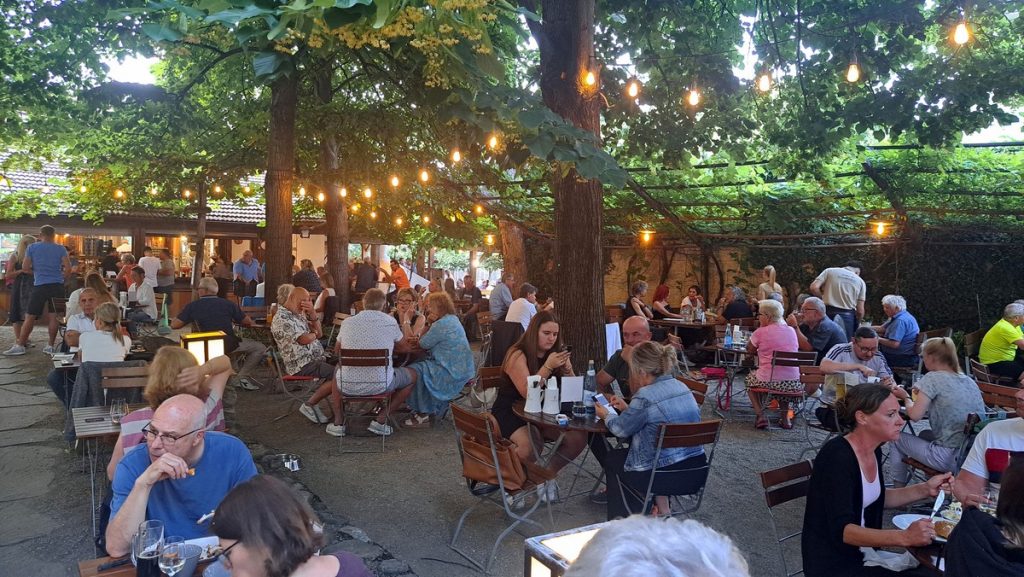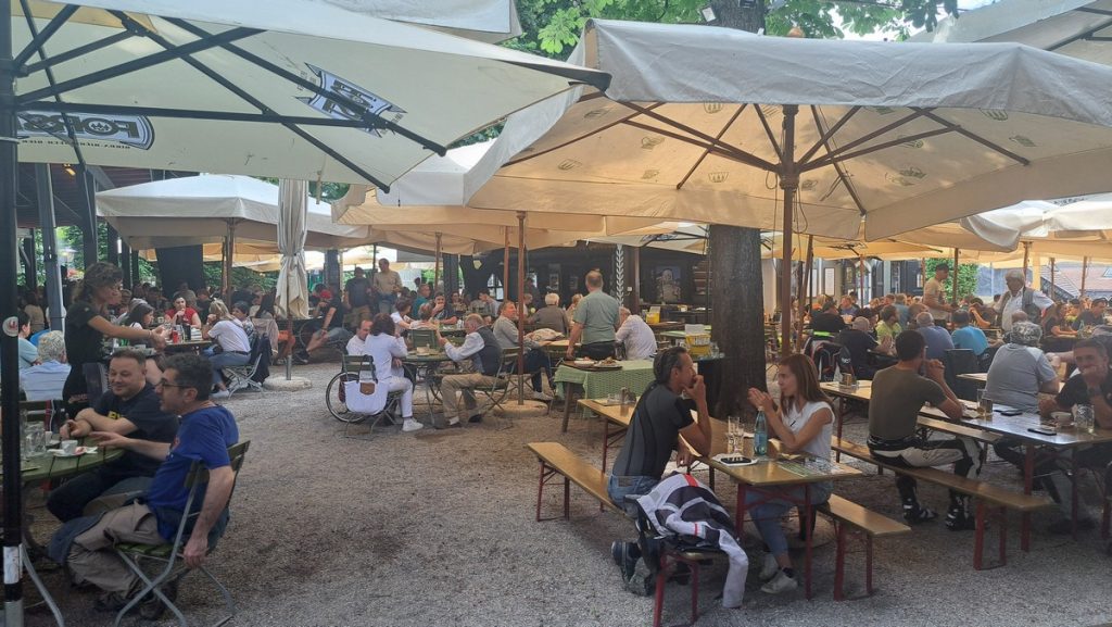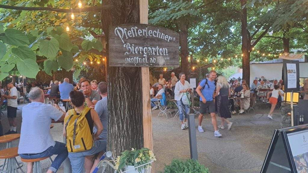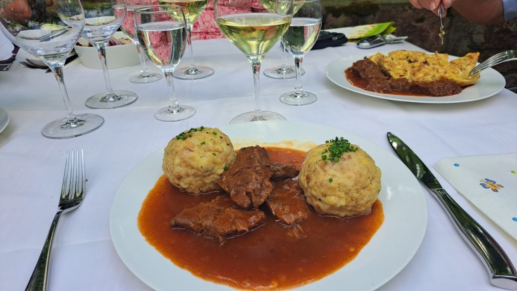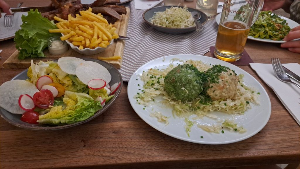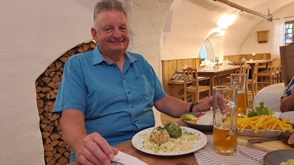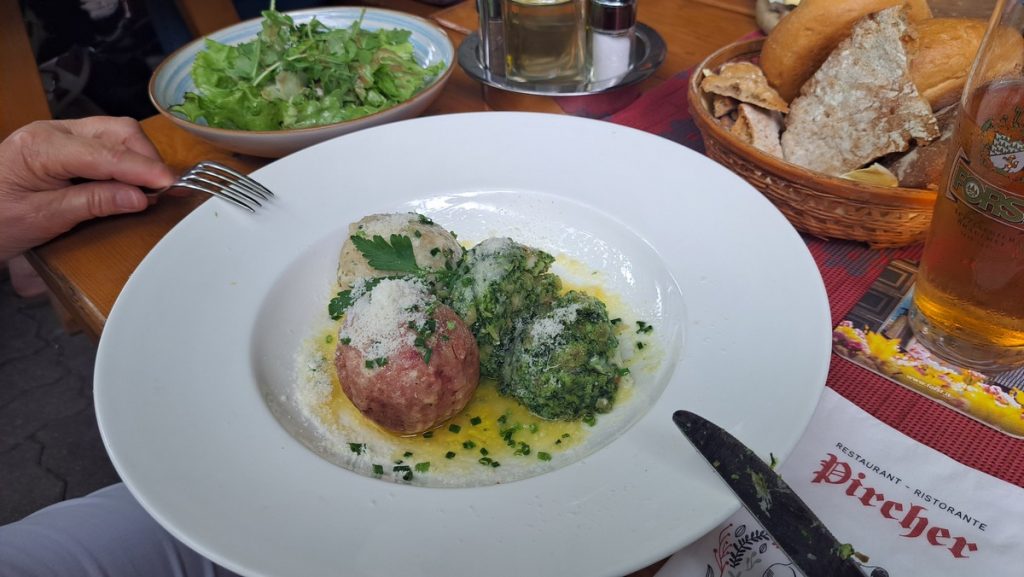 Am Nachmittag waren wir im Hotelhallenbad und am Abend fuhren wir dann nach Lana zum Buschenschank Pfefferlechner. Wir hatten nicht damit gerechnet, daß wir im Biergarten Plätze reservieren mußten. Aber heute am Pfingsmontag war es rappelvoll und alles total ausreserviert. Zum Glück wurden uns aber Plätze im Gebäude angeboten. Hier war es heute fast gemütlicher als im Trubel draussen. Überraschenderweise wurden wir gut und sehr schnell bedient. Heute gabs für mich mal wieder „Die Knödel“ und gutes „Pfeffer“ aus der Hauseigenen Brauerei.