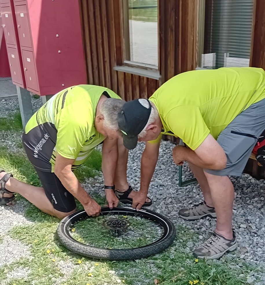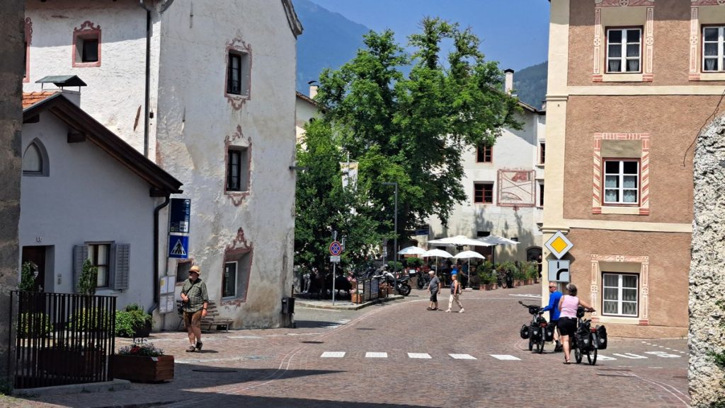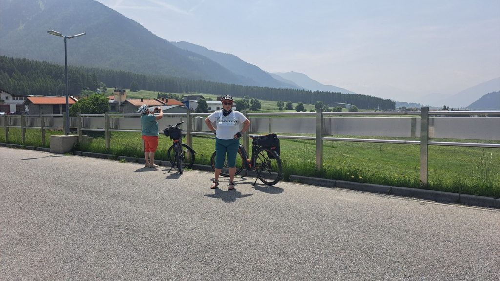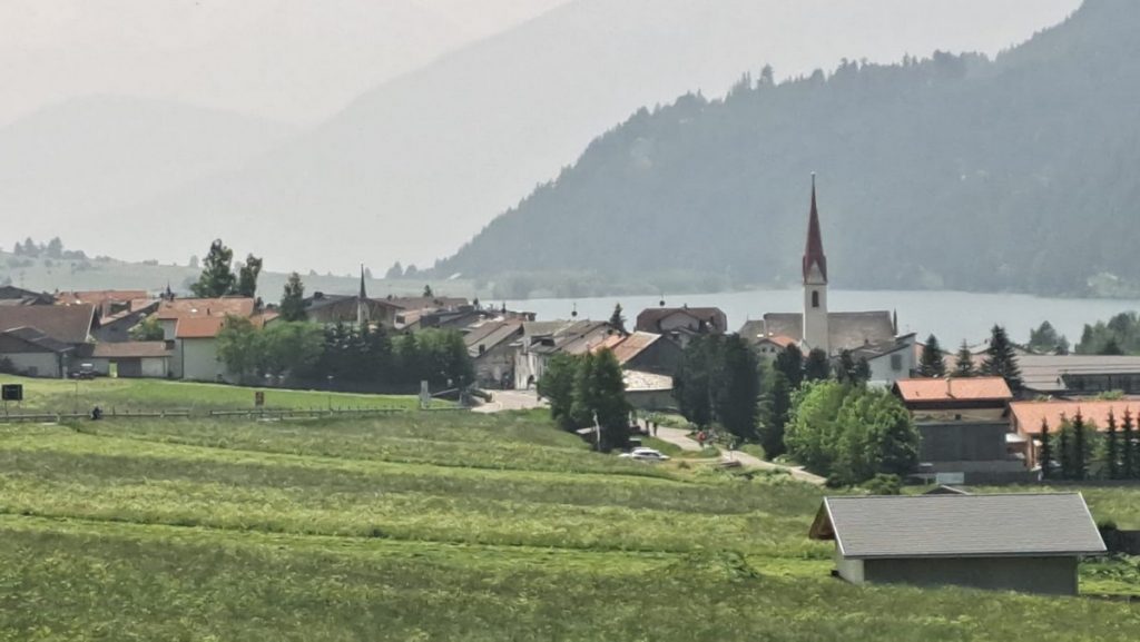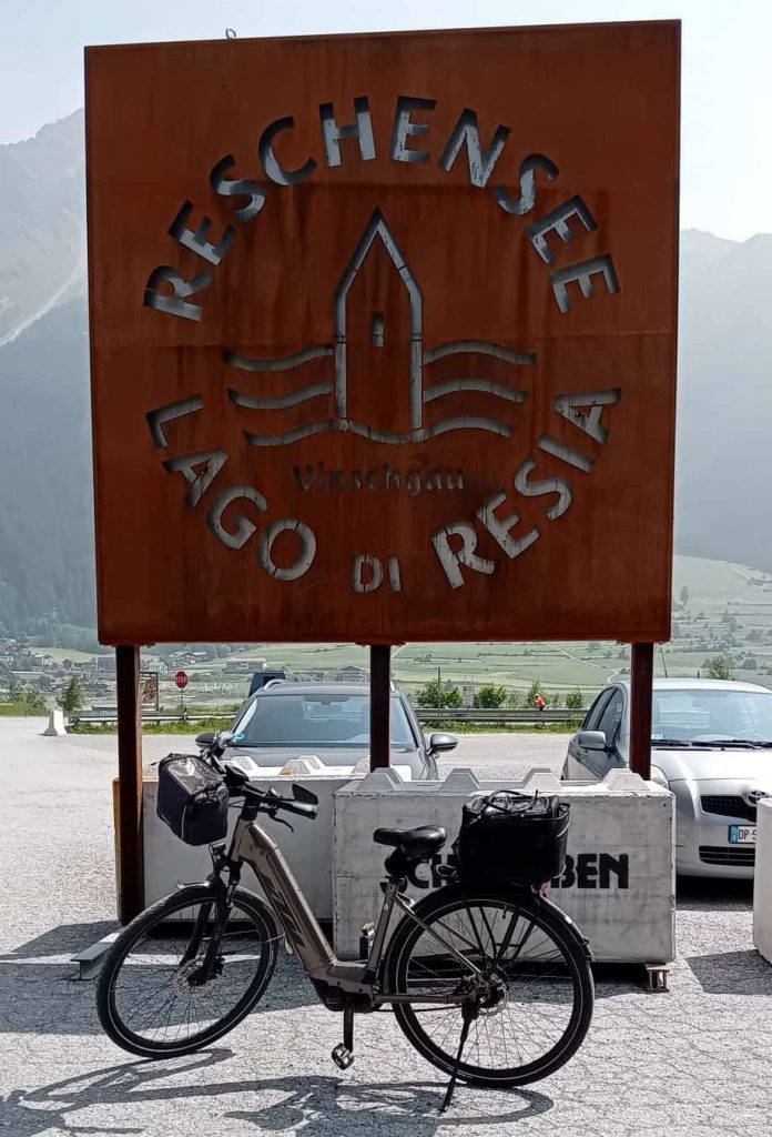 Heute mußten wir schon früher aufstehen. Wir hatten über das Tourismusbüro das Bus-Shuttle ins Vinschgau gebucht. Pünktlich um 08:15Uhr standen wir vor dem Tourismusbüro. Der Shuttlebus kam dann aber erst nach 08:30 Uhr und es dauerte eine halbe Stunde, bis unsere 4 Räder und die 4 Räder anderer Gäste verladen waren. Leider zog sich auch die Fahrt hoch zum Reschensee trotz „rasanter“ Fahrweie unseres Busfahrers ziemlich in die Länge, da es einige Staus gab. Um 11:00 Uhr konnten wir dann in Reschen mit den E-Bikes losfahren. Wir kamen aber nicht weit, da nach etwa 500 Meter, kurz hinter der Talstation der Bergbahn Schöneben, mein Vordereifen platt war. Tja was machen wir jetzt? Zum Glück hatte ich einen Ersatzschlauch dabei und an der Bergbahntalstation gab es eine Radreparaturstation. Hier half uns ein hilfsbereiter Mann bei der Montage und es gab auch einen Kompressor zum Luft aufpumpen. Jetzt konnte es aber richtig losgehen…