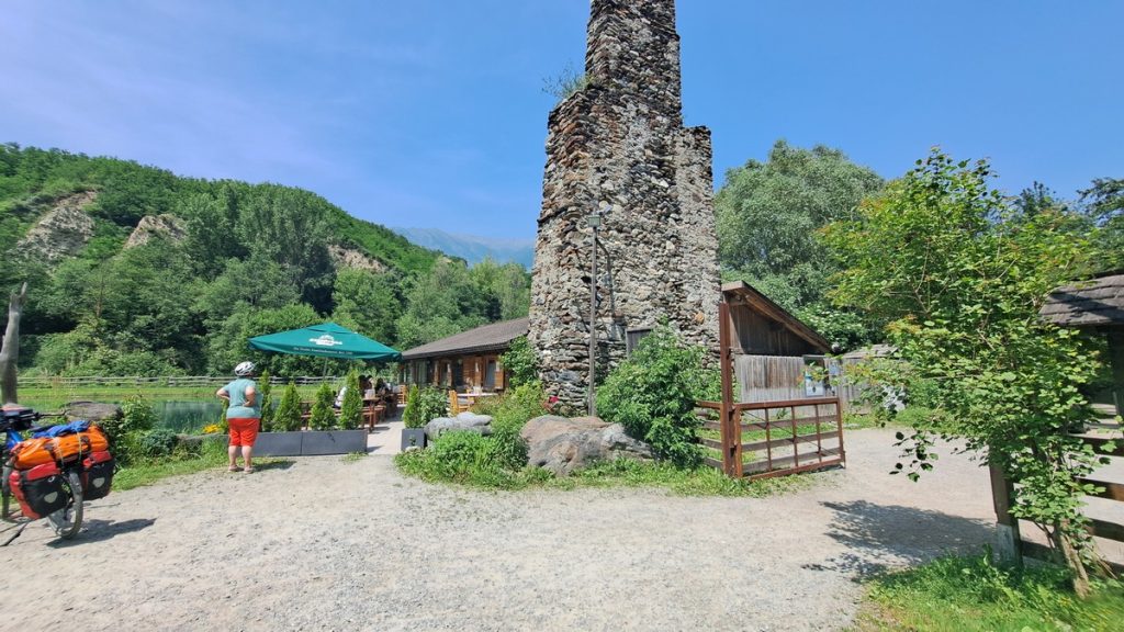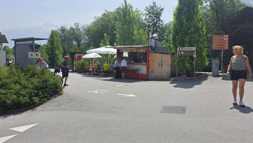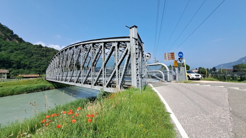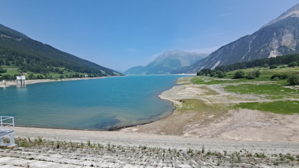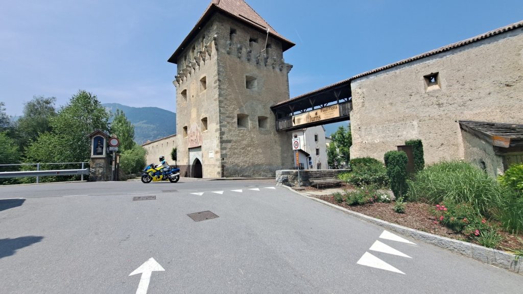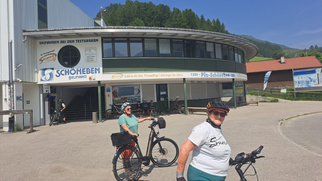 Heute mußten wir schon früher aufstehen. Wir hatten über das Tourismusbüro das Bus-Shuttle ins Vinschgau gebucht. Pünktlich um 08:15Uhr standen wir vor dem Tourismusbüro. Der Shuttlebus kam dann aber erst nach 08:30 Uhr und es dauerte eine halbe Stunde, bis unsere 4 Räder und die 4 Räder anderer Gäste verladen waren. Leider zog sich auch die Fahrt hoch zum Reschensee trotz „rasanter“ Fahrweie unseres Busfahrers ziemlich in die Länge, da es einige Staus gab. Um 11:00 Uhr konnten wir dann in Reschen mit den E-Bikes losfahren. Wir kamen aber nicht weit, da nach etwa 500 Meter, kurz hinter der Talstation der Bergbahn Schöneben, mein Vordereifen platt war. Tja was machen wir jetzt? Zum Glück hatte ich einen Ersatzschlauch dabei und an der Bergbahntalstation gab es eine Radreparaturstation. Hier half uns ein hilfsbereiter Mann bei der Montage und es gab auch einen Kompressor zum Luft aufpumpen. Jetzt konnte es aber richtig losgehen…