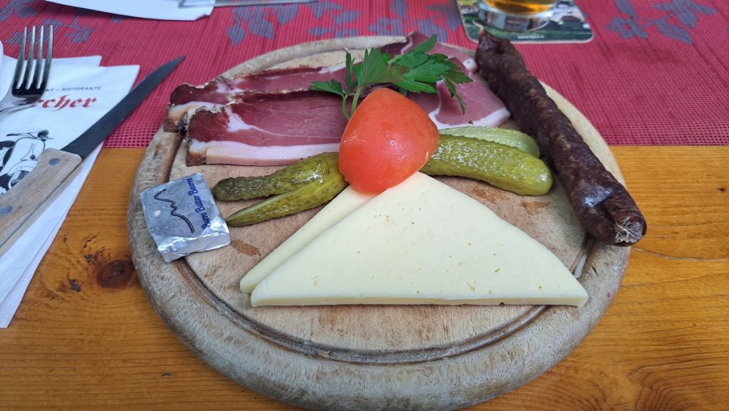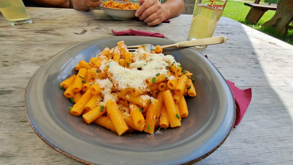 Mittags konnten wir die Zimmer dann beziehen und wir fuhren gleich mal zu viert per Auto auf engen Bergstraßen über Nals, Prisian und Tisens zum Buschenschank „Hofstätterhof“ hoch. Hier gabs leckere Hirtenmakaroni und eine super Aussicht zu genießen.