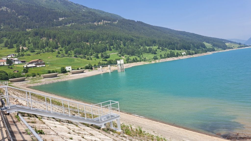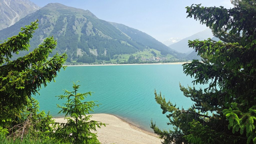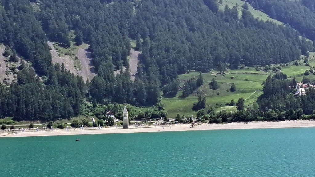 Am Reschensee – Blick auf den Turm der versunkenen Kirche
