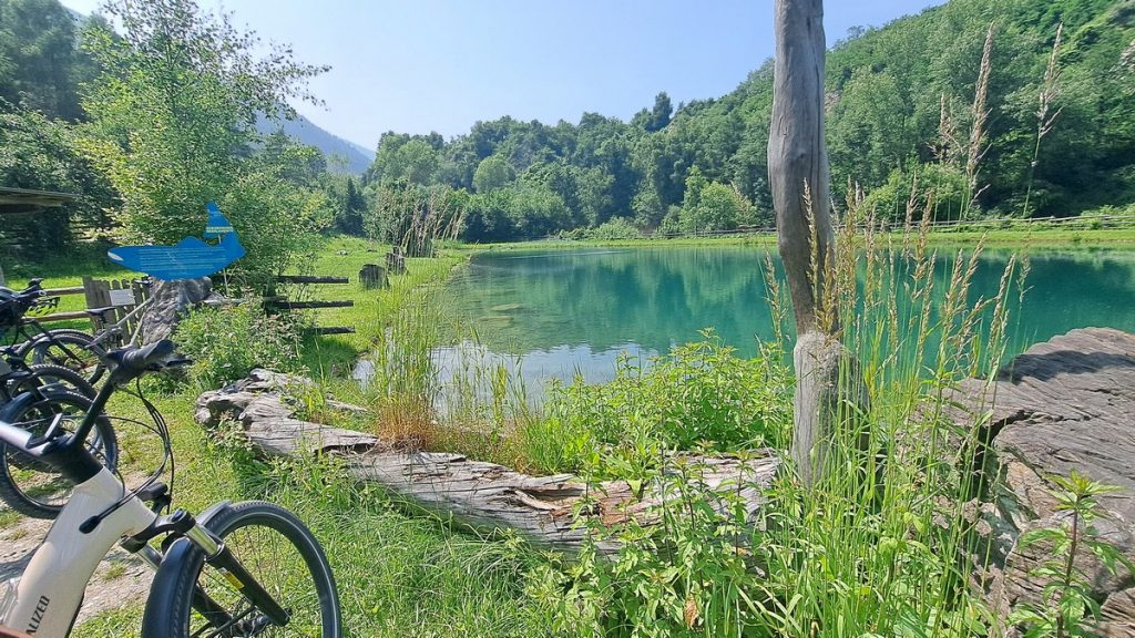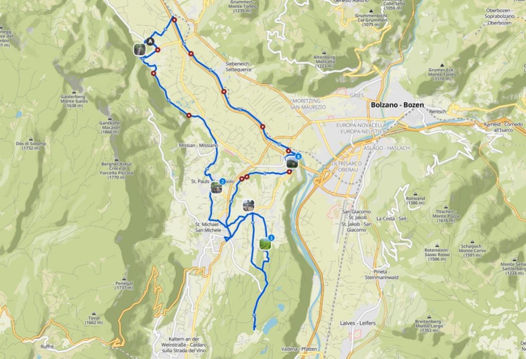 Heute war ich nach dem Frühstück mal allein per Rad unterwegs. Ich fuhr wieder Richtung Kaltern, bog dann aber in St.Michael nach Girlan ab. Ich folgte dann einer Straße die weiter nach oben führte und kam dann an die Sportanlage vom FC Südtirol. Hier sah ich einen Wegweiser zu den Montigler Seen. Auf diesem Kiesweg fuhr ich zum Parkplatz an den Seen. Dann ging es über Girlan, St.Michael und St.Pauls wieder zurück nach Andrian.