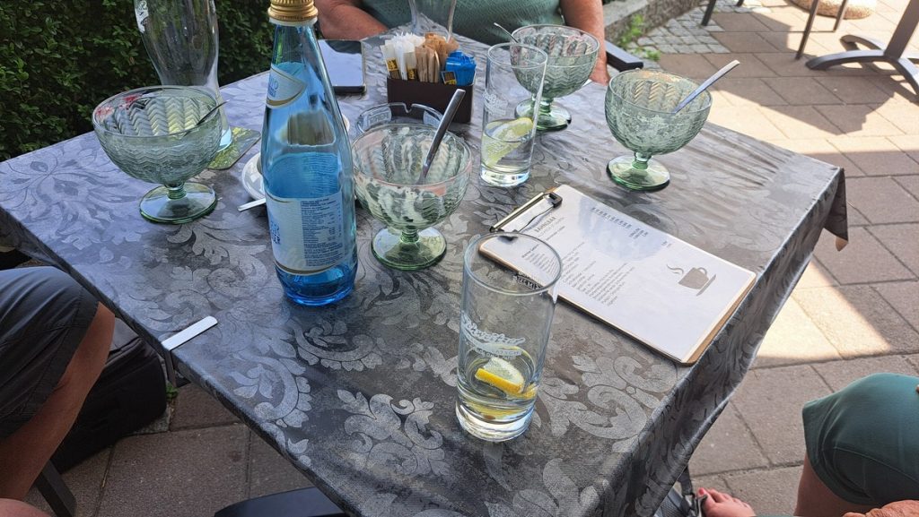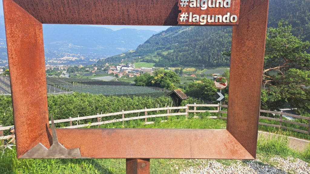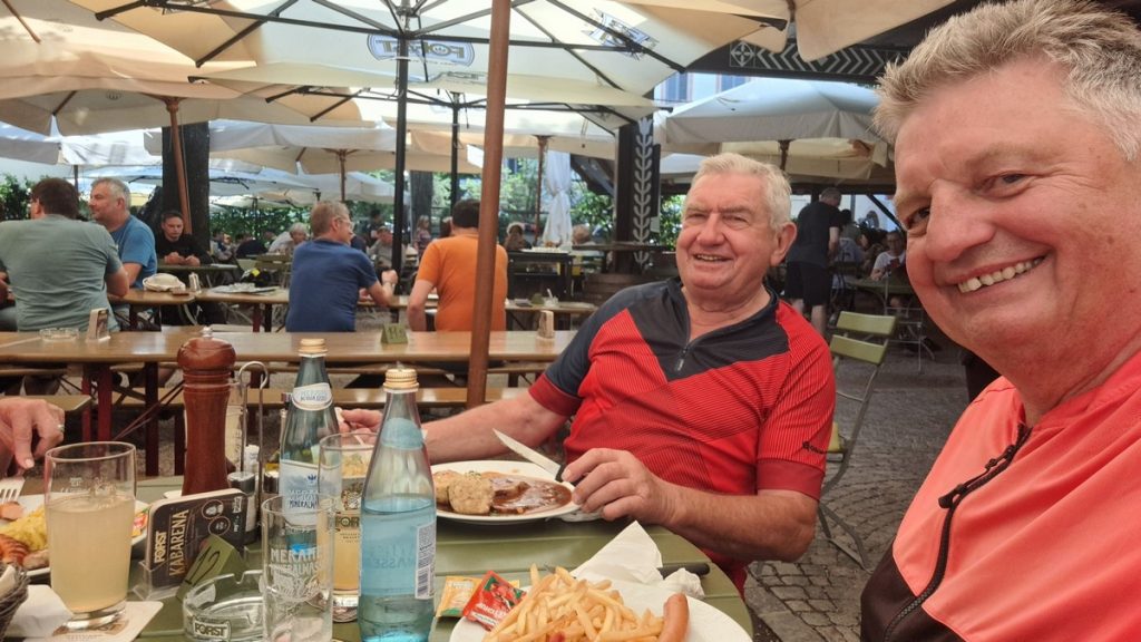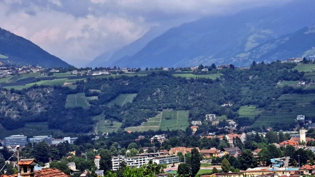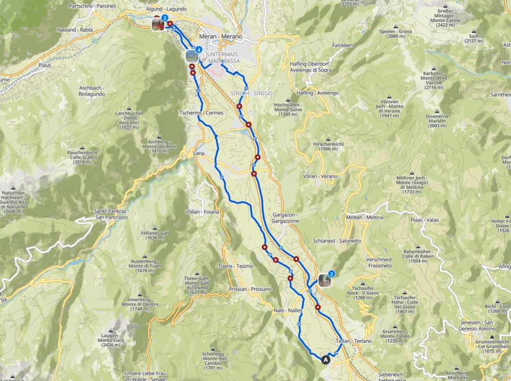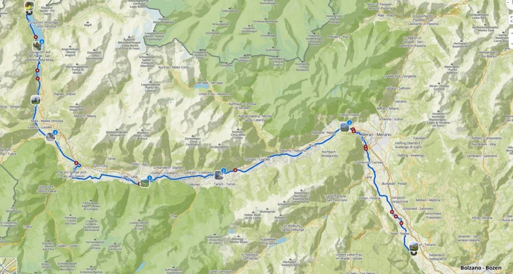 Der Weg führte von Reschen aus über St.Valentin, Schleis und Laatsch immer bergab bis nach Glurns, wo es für uns eine Mittagspause an einem Würstlstand gab. Immer in der Nähe oder direkt der Etsch entlang ging es dann über Prad, Laas und Göflan nach Latsch, wo wir bei inzwischen 34 Grad eine Eispause einlegten. Der Radweg führte dann nach Kastelbell, Naturns, Plaus, Algund und Forst. Hier gabs im Biergarten eine Brotzeitpause. Über Marling, Tscherms und Lana erreichten wir dann nach 105 Kilometern unser Hotel in Andrian. Es war eine sehr schöne, aber vor allem wegen der hohen Temperaturen doch auch eine anstrengende Tour.