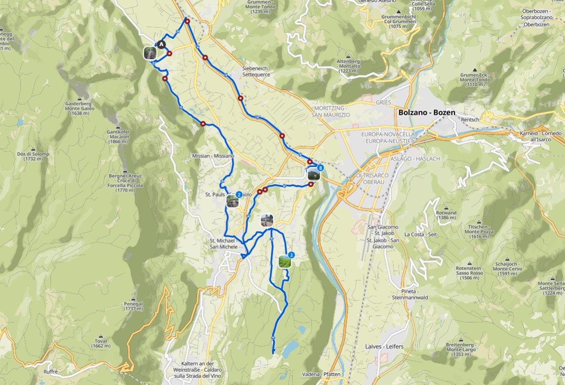 Nach dem Frühstück reisten heute zwei unserer Radlerfreunde ab. So starteten wir zu viert auf eine gemütliche Tour nach Bozen, das wir auf dem Etschtalradweg über Sigmundskron und dann weiter an der Eisack erreichten. Wir fuhren durch die Parks an der Talfer bis kurz vor dem Schloß Runkelstein und zurück an der „Bozner Wassermauer“. Hier machten wir auf einen Aperol und einen Snack Pause. Zurück nach Andrian ging es dann auf demselben Weg.