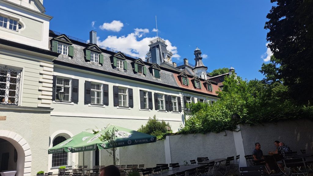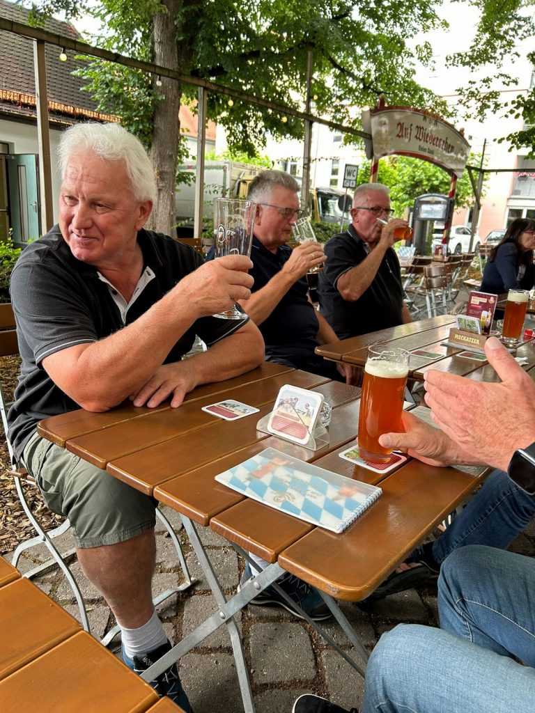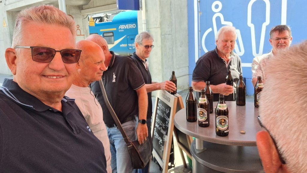 Unterwegs hielt der Zug ziemlich oft um Mitfahrer ein- oder aussteigen zu lassen. Aber wir kamen entspannt in München an und nahmen dort gleich den Zug nach Freising. Kaum dort angekommen stand auch schon der Bus nach Rudelzhausen bereit. So kamen wir schnell zurück in die Hallertau. Natürlich gabs für einige von uns noch einen Halt in Au mit Brotzeit im Biergarten vom Schloßbräukeller. Der nächste Bus brachte dann auch uns zurück nach Rudelzhausen.