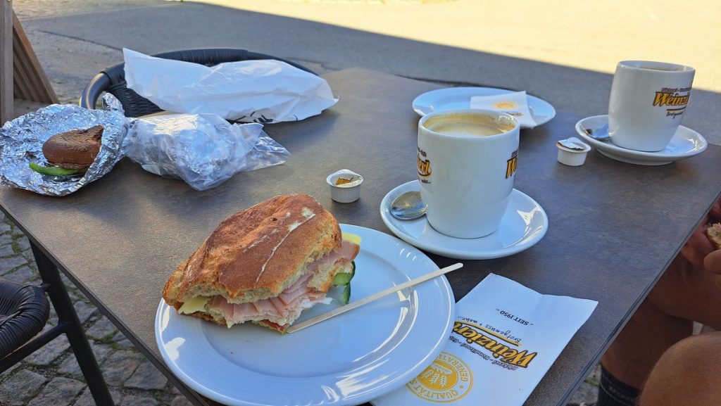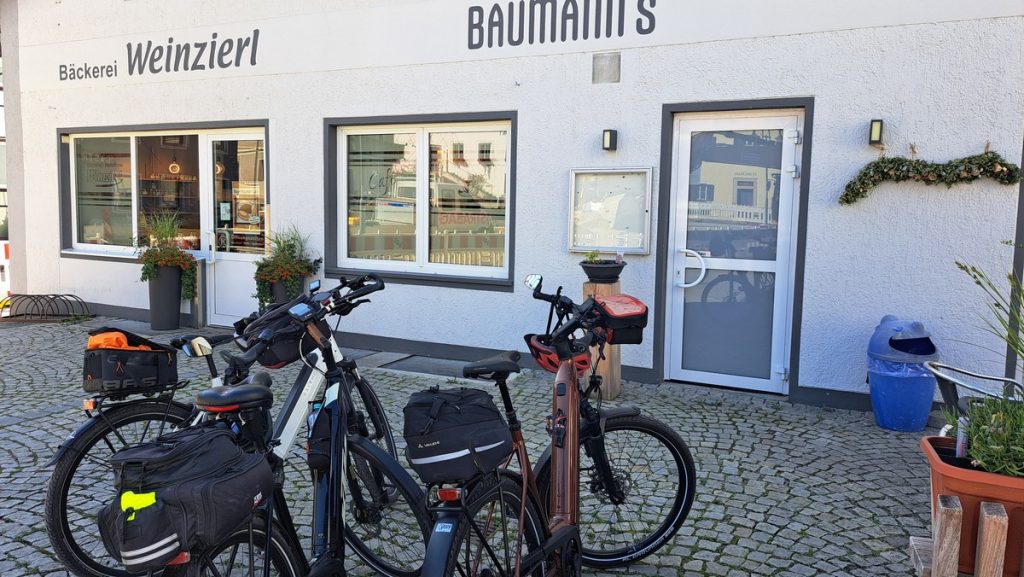 Beim Start war es mit 14 Grad noch ziemlich kühl, so daß wir leichte Jacken angezogen hatten. Außerdem war es heute ziemlich windig. Wir fuhren auf derselben schönen Strecke nach Straubing wie bei den letzten Fahrten. Bei der ersten Wasserpause kurz nach Pfeffenhausen war es dann wärmer geworden und wir zogen unsere Jacken aus. Nach 52 km wurde in Mallersdorf vor einer Bäckerei eine etwas längere Kaffeepause eingelegt. Dazu gab es ein süßes oder auch deftiges Gebäck.